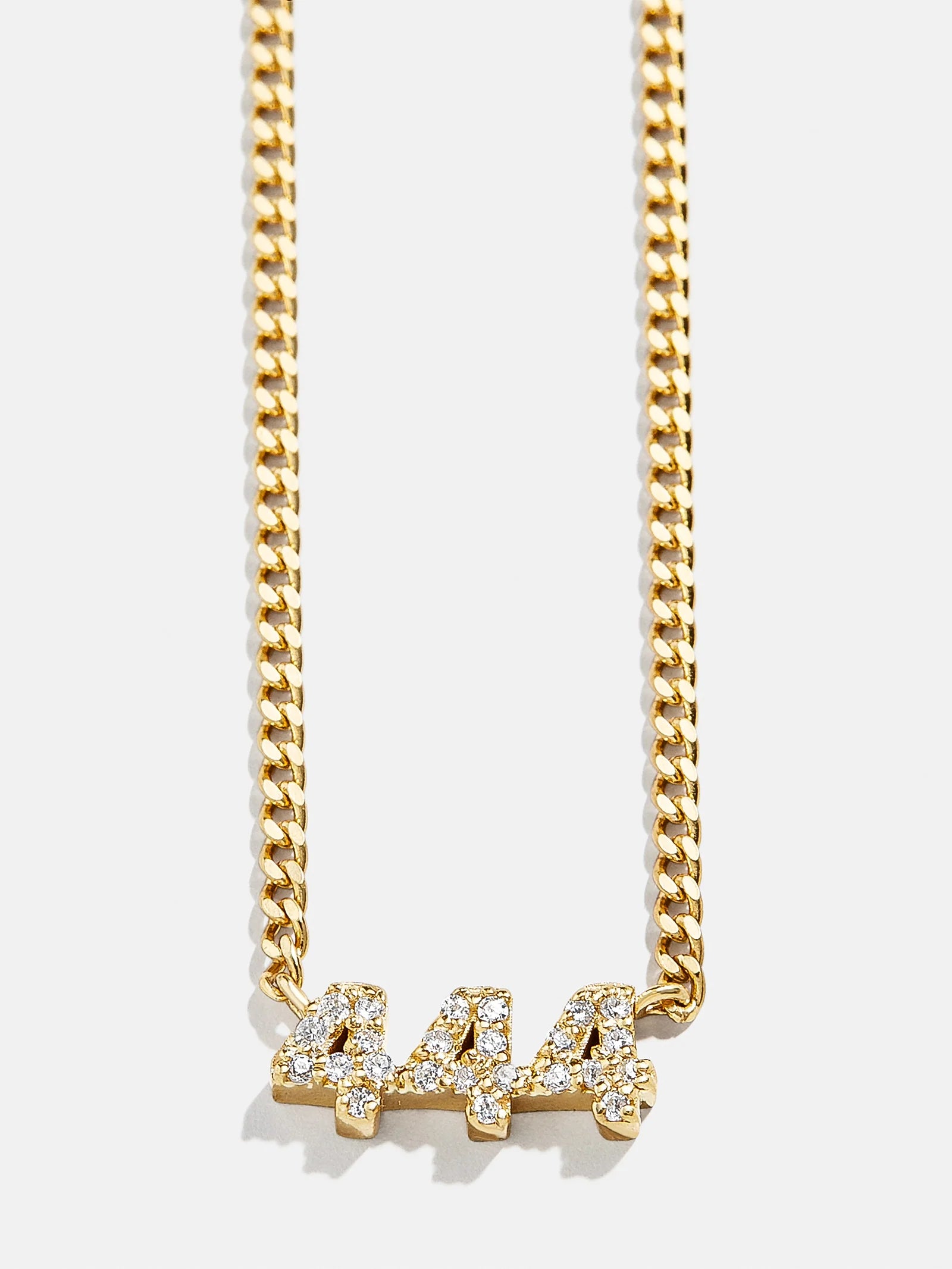 Do you see a certain sequence of numbers everywhere you go? It might be an angel number, sending you a subliminal yet meaningful message from the universe. Pay an ode to these special symbols with our 18K Gold Angel Number Custom Nameplate Necklace, available in an all-gold or gold with pavé version. Choose the repeating number 0-9 that you keep seeing, and it'll be crafted in a row of three. See our key for the meaning and message behind each angel number. This necklace is crafted with 18K Gold and Cubic Zirconia stones.