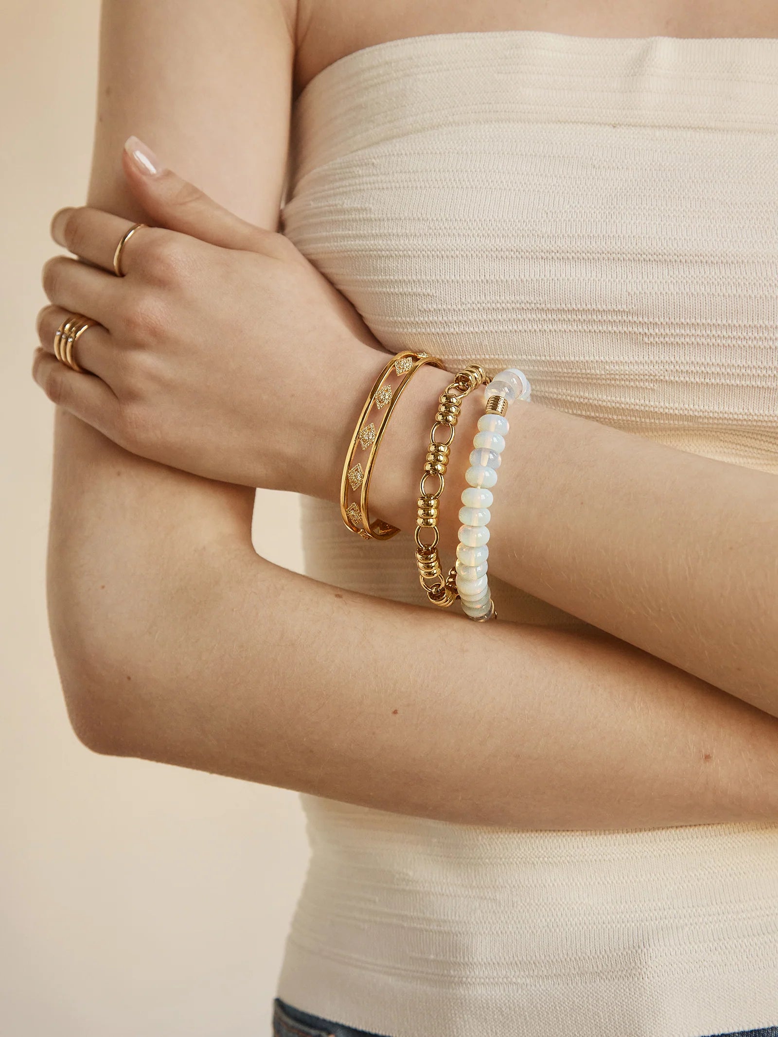 Protect your energy with the sleek 18K Gold Evil Eye Cuff Bracelet. Featuring repeating pavé evil eyes, this cuff adds a modern twist to your wrist stack while offering sentimental meaning. Crafted with 18K Gold and cubic zirconia stones, it's a timeless piece that’ll always add good vibes.