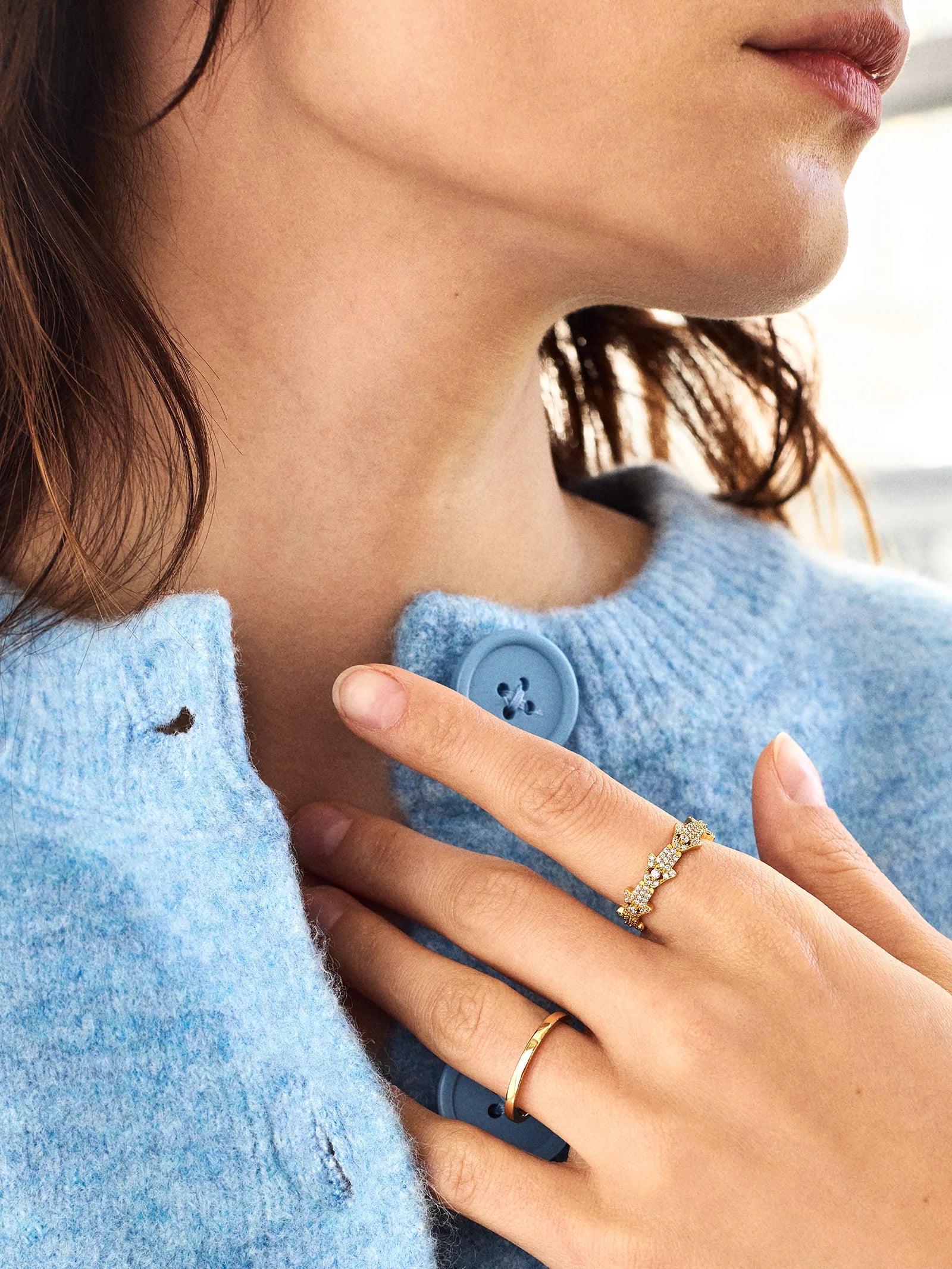 Create a ring stack that brings up the good vibes with the 18K Gold Pavé Hamsa Ring. The motif of your choice is repeated throughout this ring, all colored in the same classic gold. Whether you choose repeating hearts or evil eyes, this ring brings elegant personality to any look.