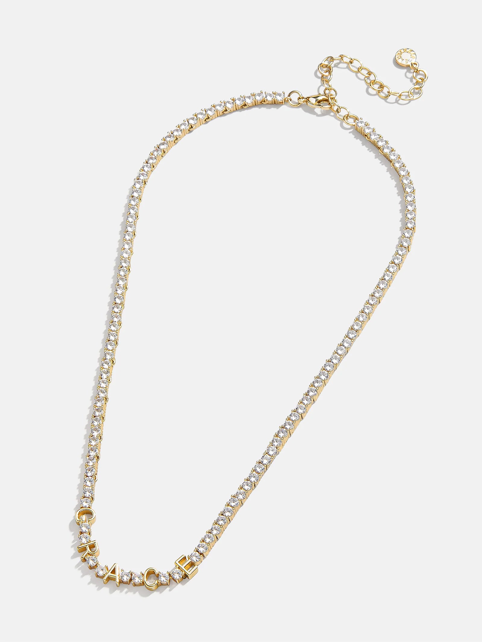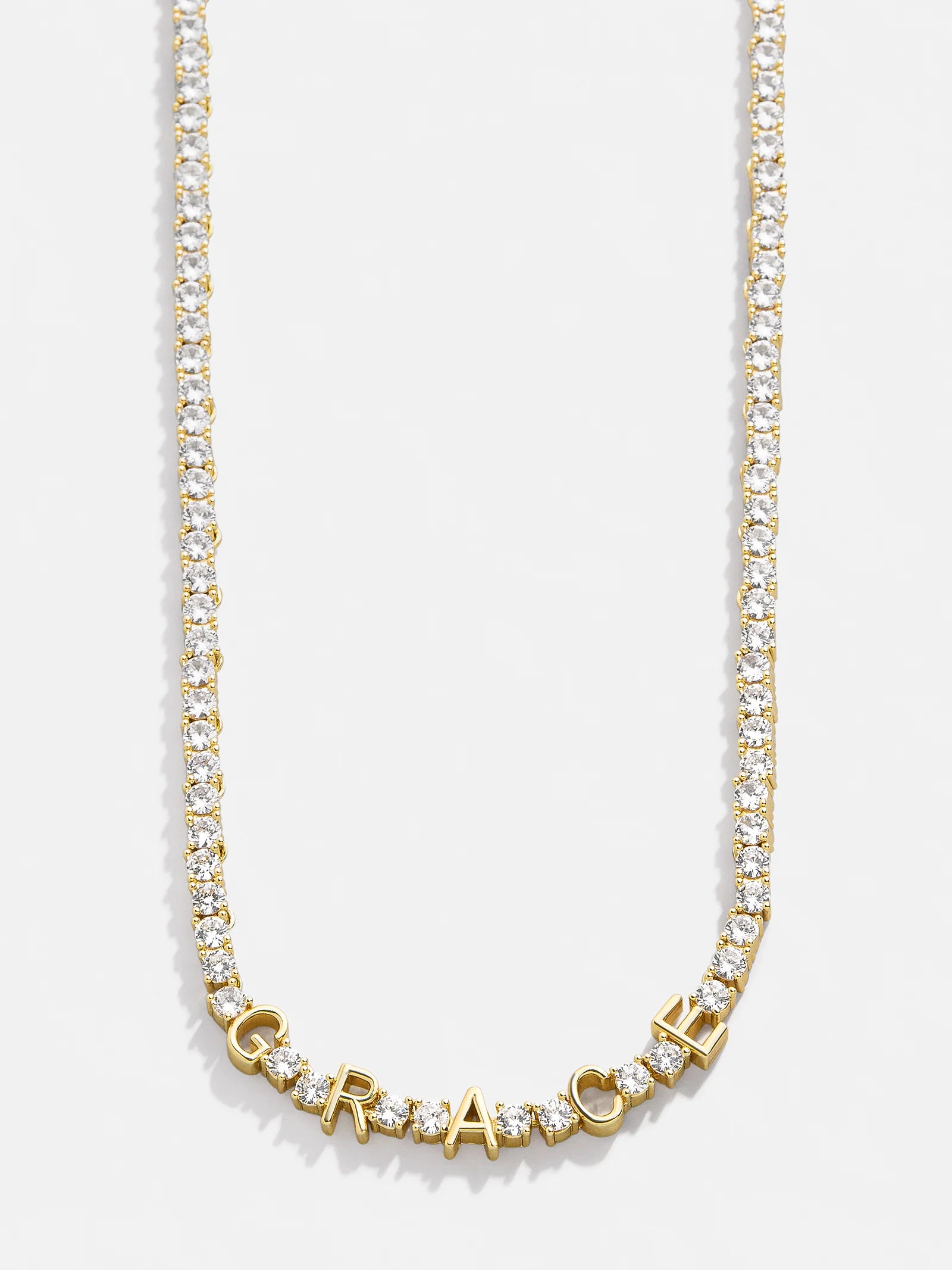Our best-selling Bennett Tennis Necklace and Bracelet Collection wouldn't be complete without a personalized piece. Our Bennett Custom Tennis Necklace, made with luxe Cubic Zirconia stones, takes the classic eternity band design and adds modern gold letter beads. Handmade just for you, pick a name or phrase for a contemporary addition to your neck stack. See our Letter Key for all options available.