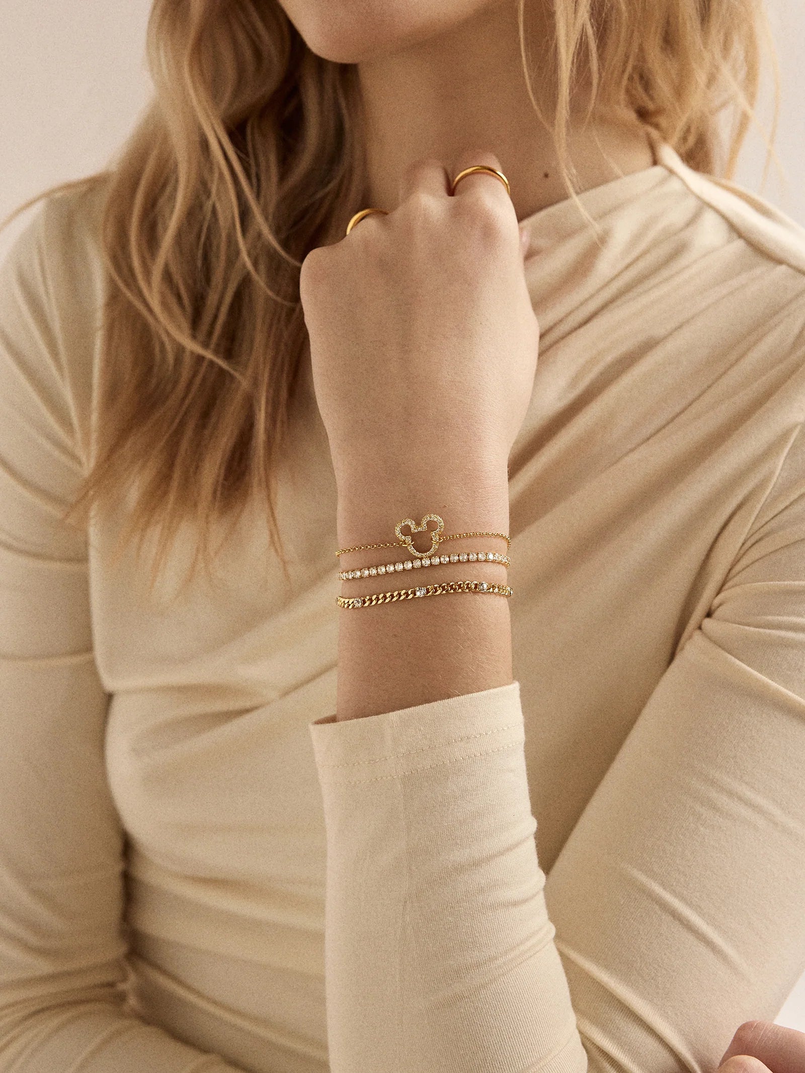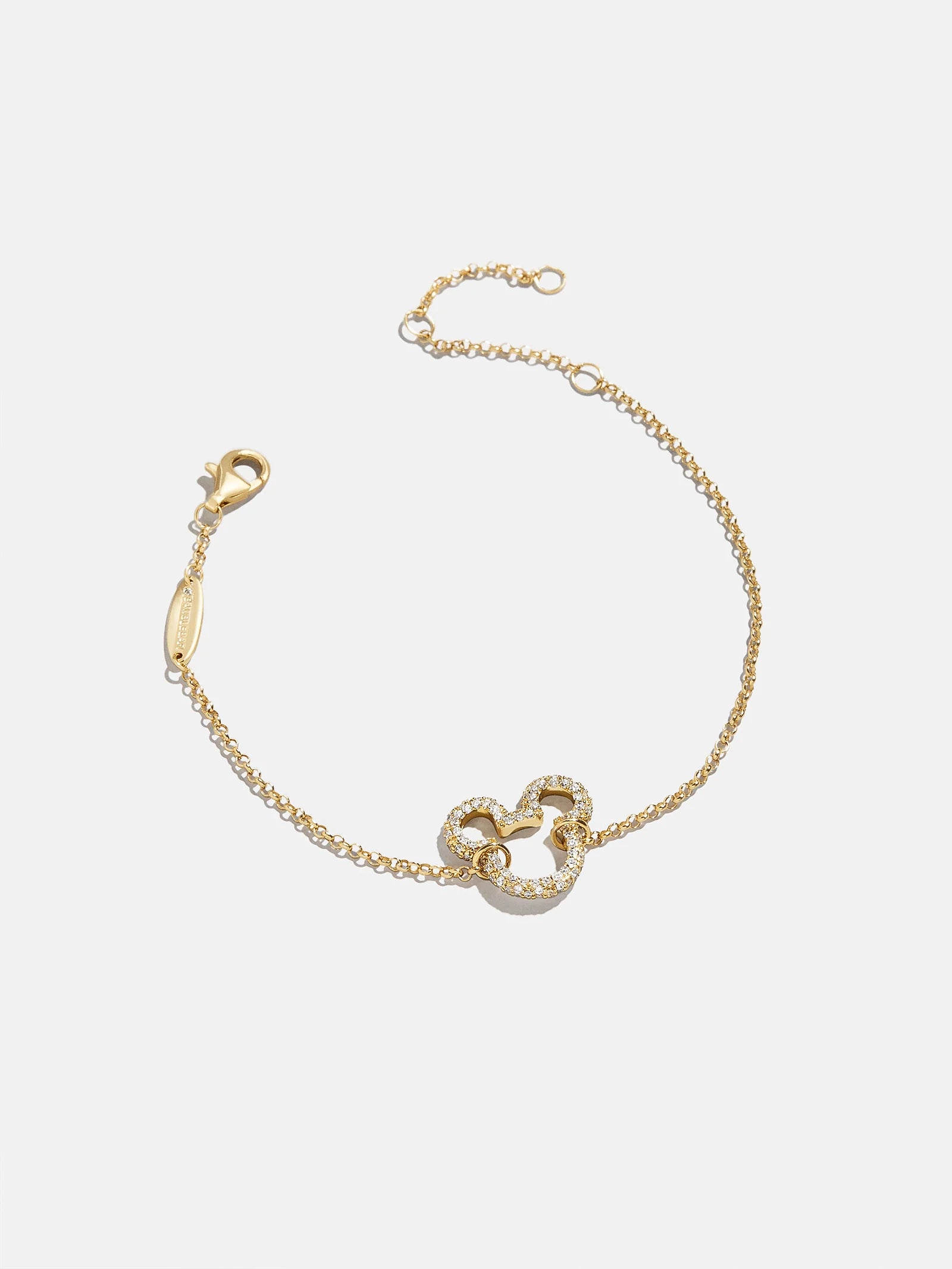 Dainty and sweet, this Mickey Mouse bracelet is a staple accessory for any Disney fan. A shimmering outline of Mickey Mouse sits on a delicate gold band. Crafted out of 18k gold plated sterling silver and cubic zirconia stones, it’s designed to shine for years — whether you wear it solo or stacked with others.