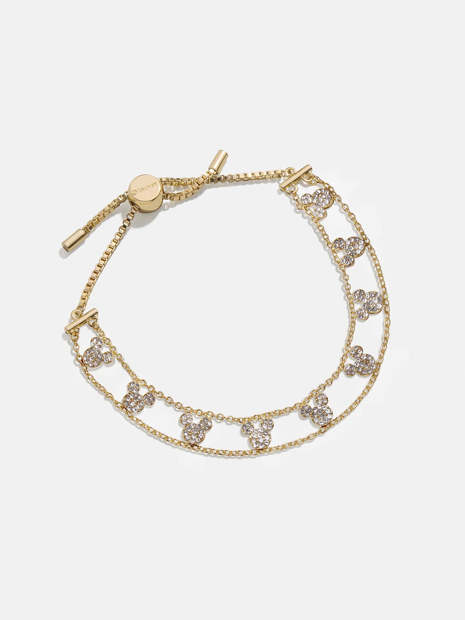 Slide into style with the Mickey Mouse Disney Repeating Slider Bracelet. This fandom bracelet features glass stones on a repeating pattern of Mickey's iconic silhouette on a sleek slider design, adding a touch of playful Disney charm to your wrist. Perfect for fans of the beloved mouse, it's a fashionable and versatile accessory that complements any outfit with a hint of magic.