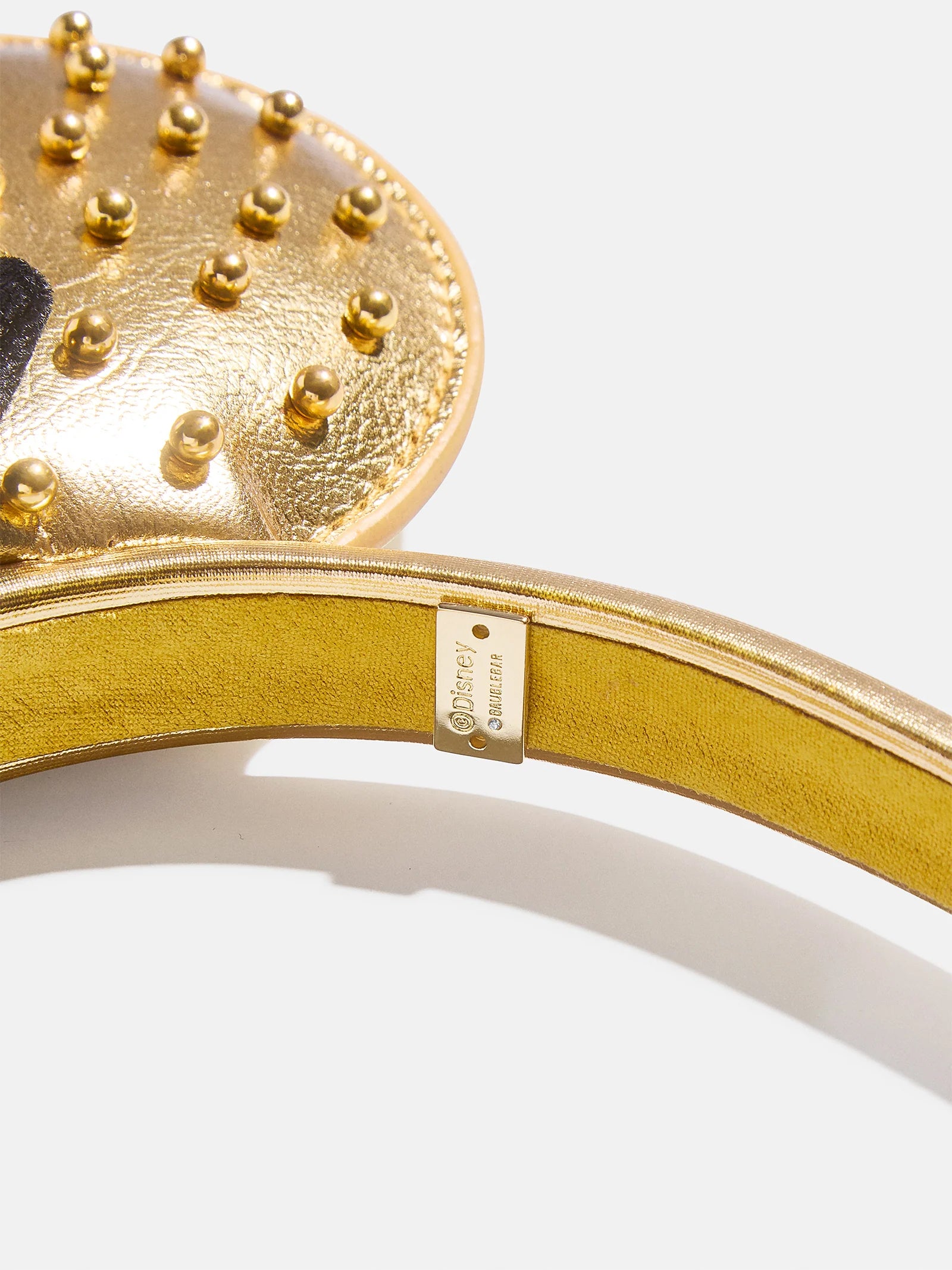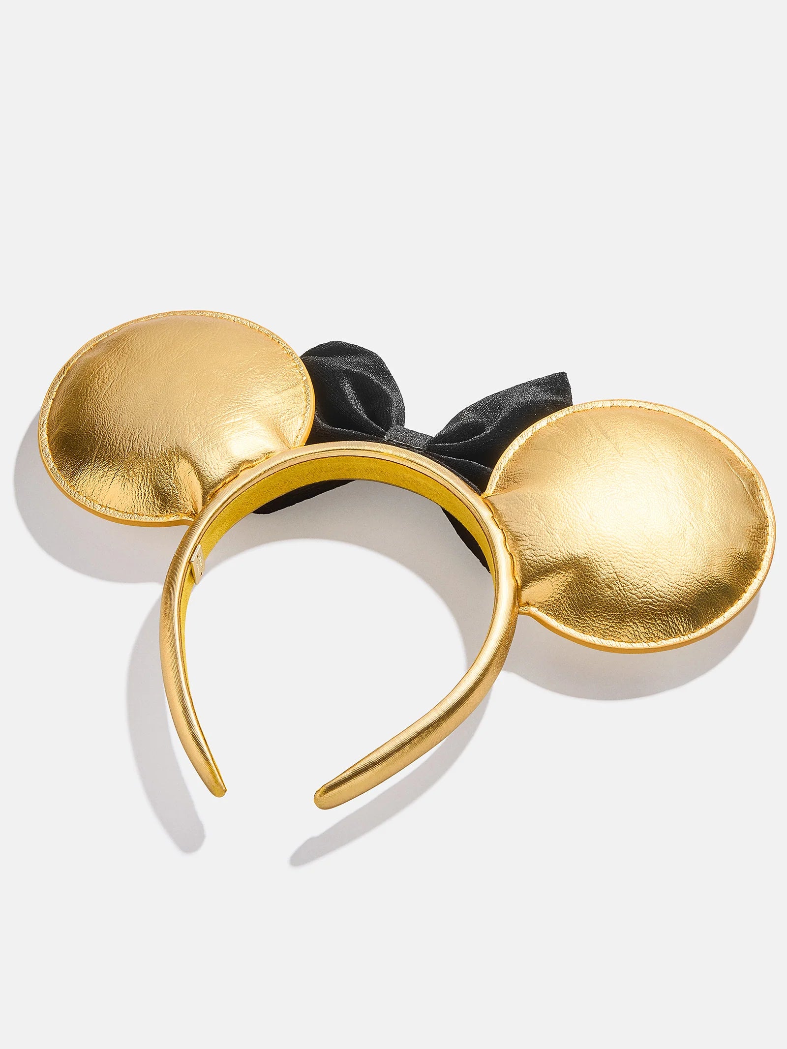 Step into the spotlight with the Minnie Mouse Gold Ears Headband. Its gold ears feature decorative pisa beads, and a chic black bow. A must-have for any Minnie fan, this headband brings a touch of Disney glamour to special events and celebrations.