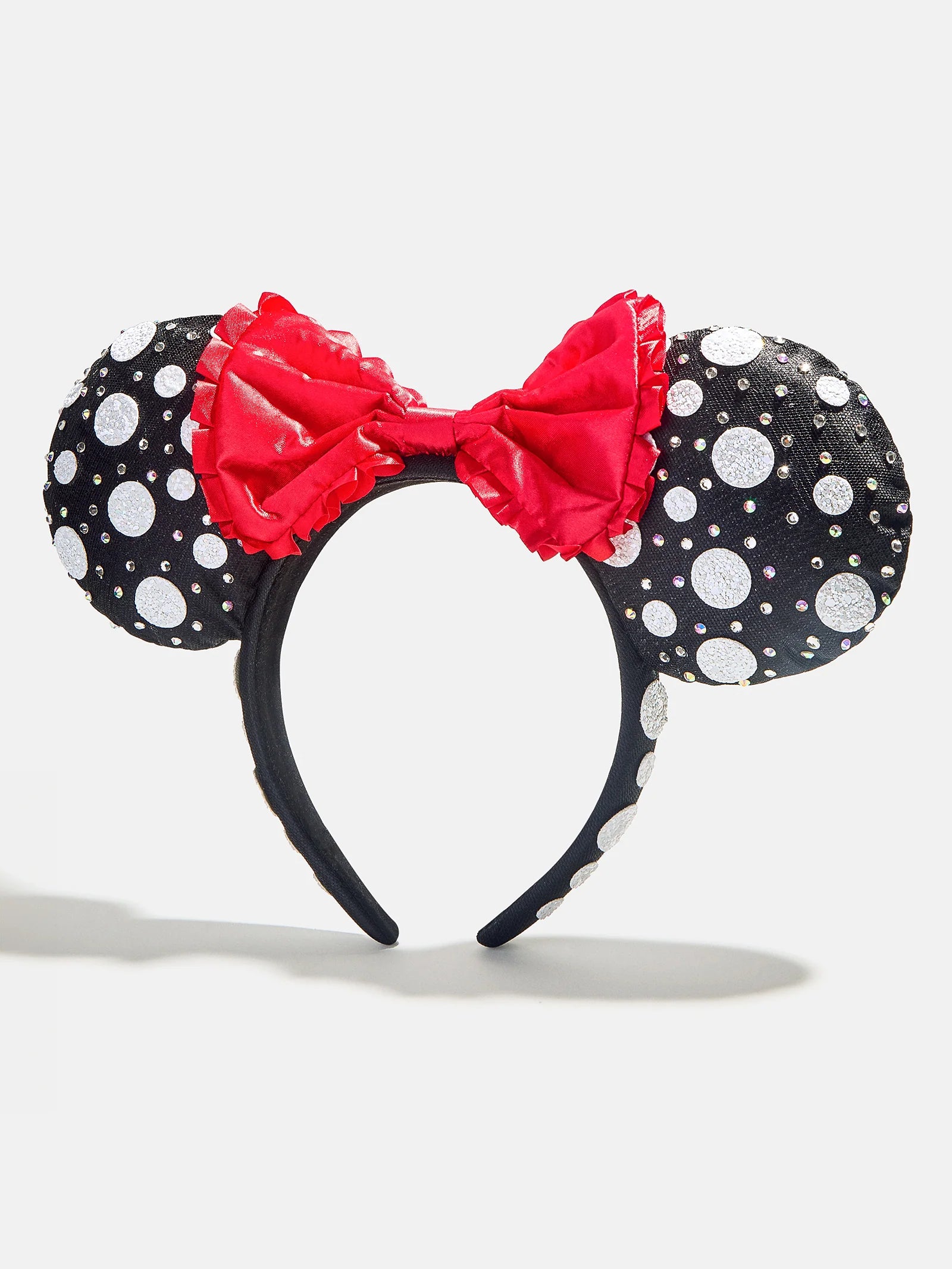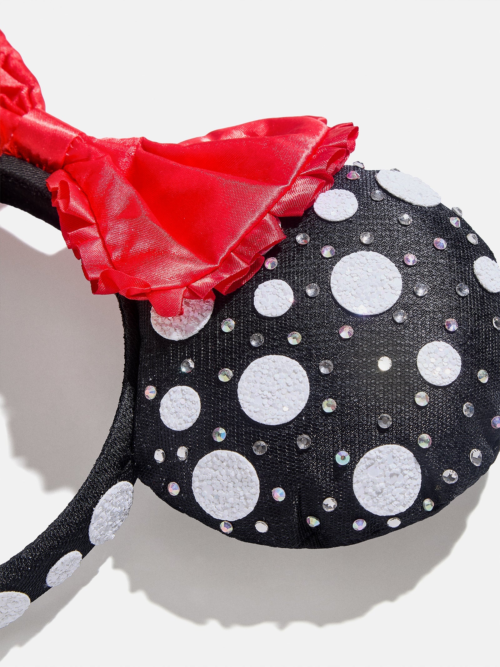 Channel Minnie Mouse’s iconic style with this charming take on her classic ears design. These Disney ears feature white polka dots and shimmering crystal accents. Finished with Minnie’s signature red bow — complete with an elegant scalloped trim — this headband is a must-have for any fan who adores the timeless classics.