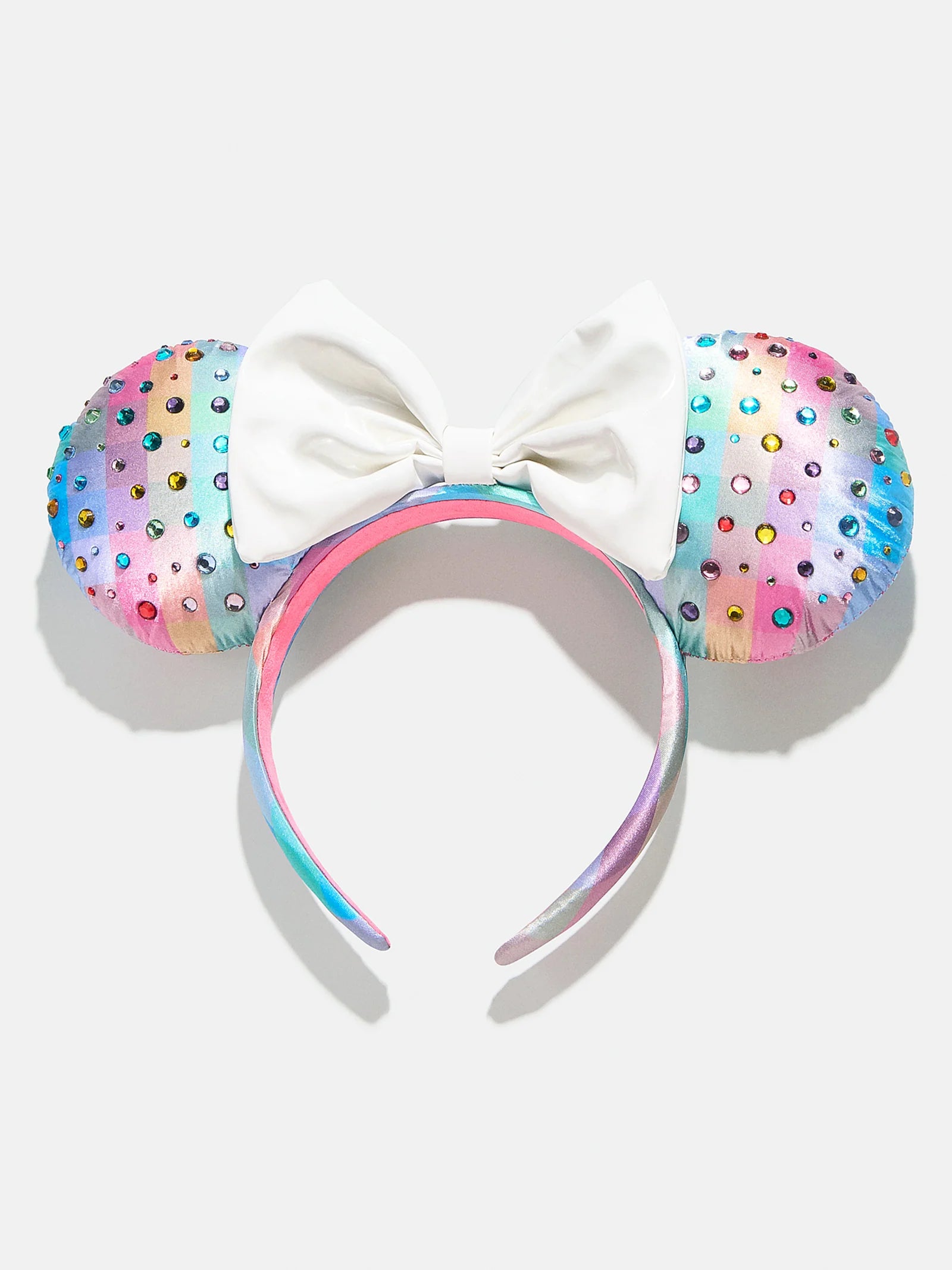 Colorful and bright, this Disney Minnie Mouse Rainbow Ears Headband will have you smiling from ear to ear. Minnie’s signature ears are decked out in a playful mix of rainbow patterns, dazzling multicolored gemstones, and a white patent bow. Perfect for theme parks, birthday parties, or anytime you want to channel your inner Minnie, these ears are a fun way to live in color.