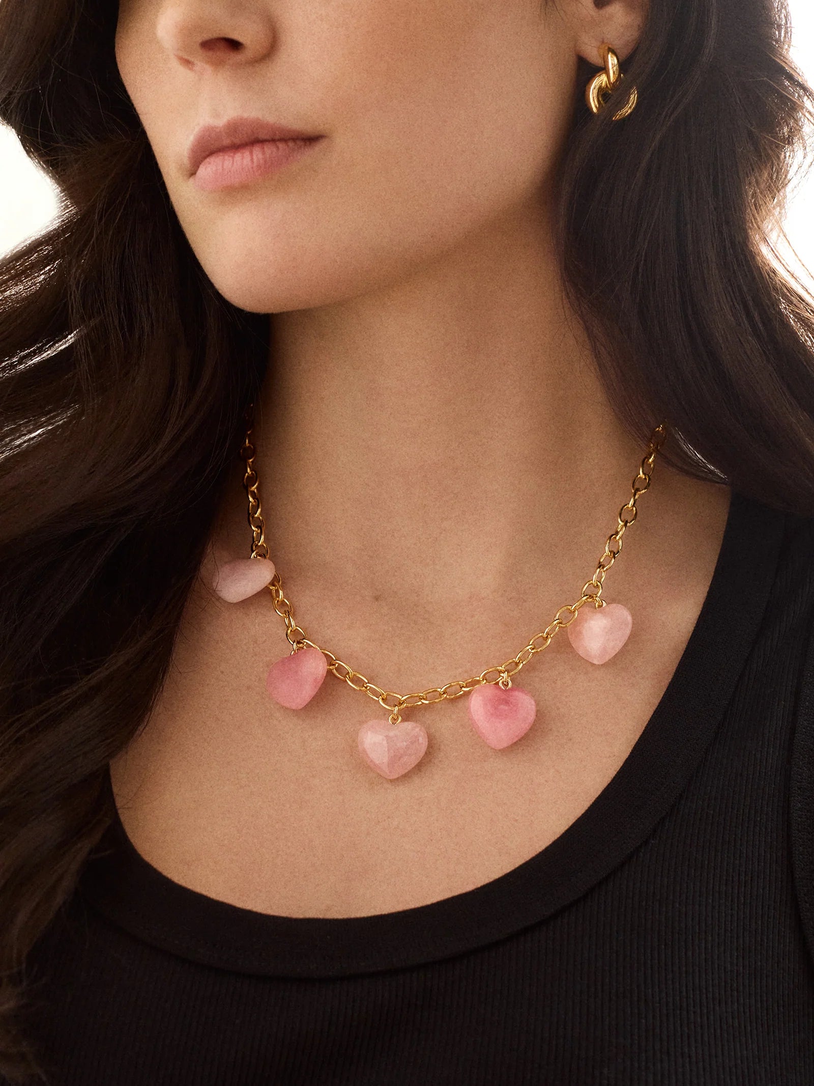 Life's too short to not have fun with your accessories. The Esme Statement Necklace features a gold-colored chain and 5 pink semi-precious heart charms. It's cute and playful yet chic enough to wear anytime you want to add love to your look.