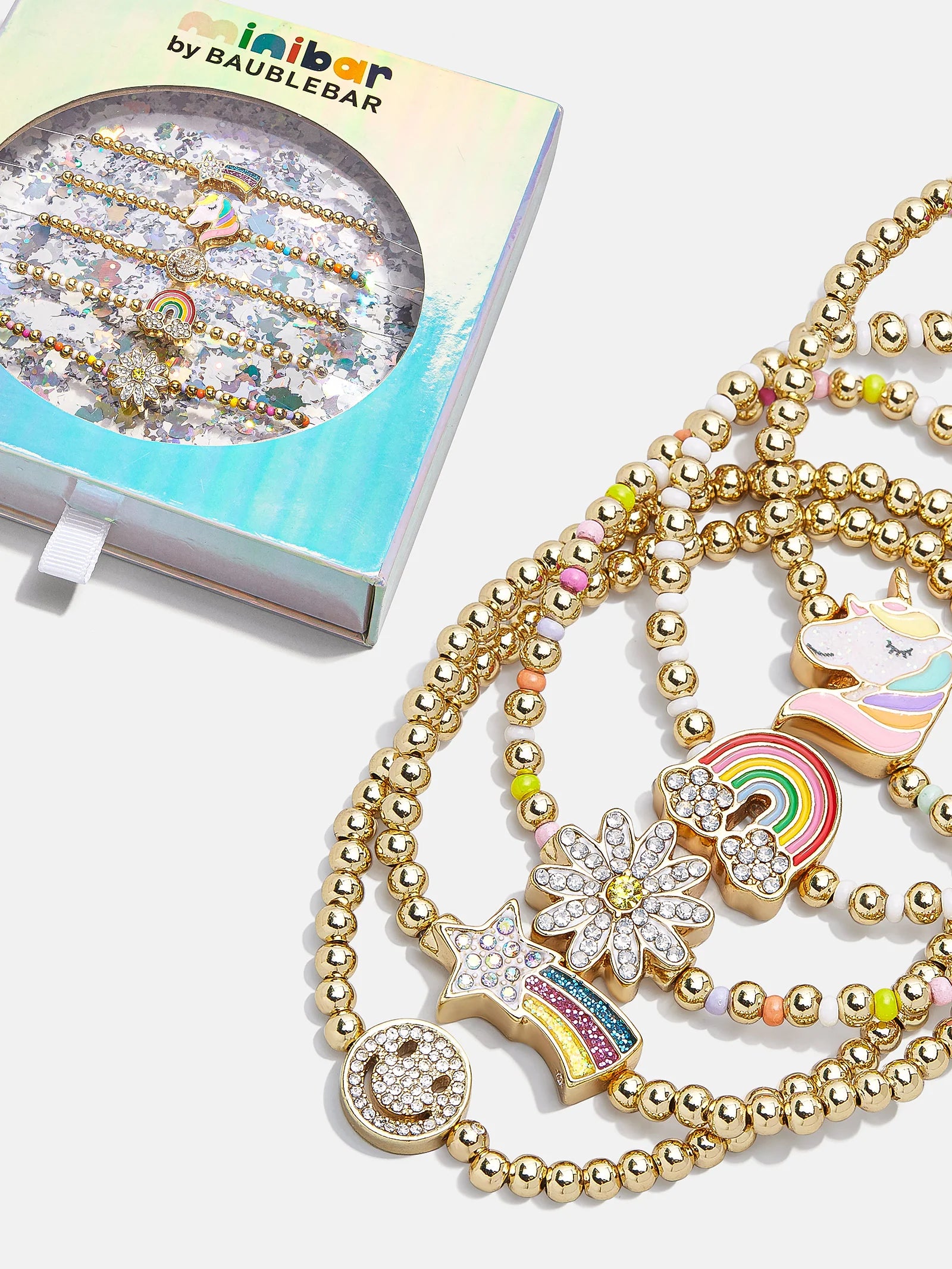 The Favorite Things Kids' Pisa Bracelet Set comes with five unique gold beaded bracelets. Each bracelet is complete with a bead in the center in a range of fun motifs: a unicorn, a rainbow, a flower, a shooting star, and a smiley face. Gift as a set to your little one, or split them apart to gift to them and all of their friends.