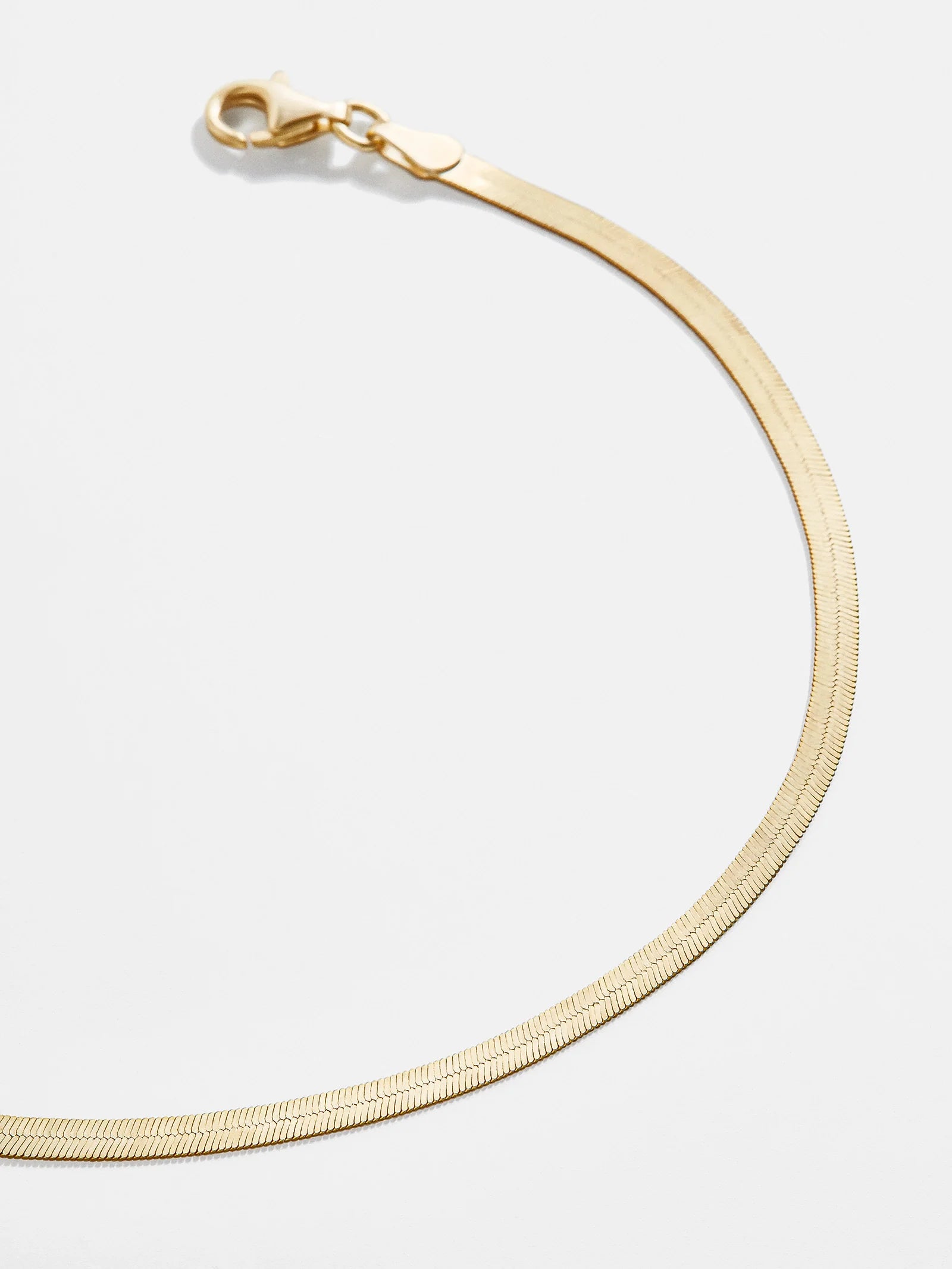 A slinky snake chain bracelet is a style that's certain to get plenty of wear. We especially love this herringbone piece paired with other delicate bracelets. Hand-crafted using your choice of 14K Gold or sterling silver, the Gia Bracelet is one you'll stack for a lifetime.