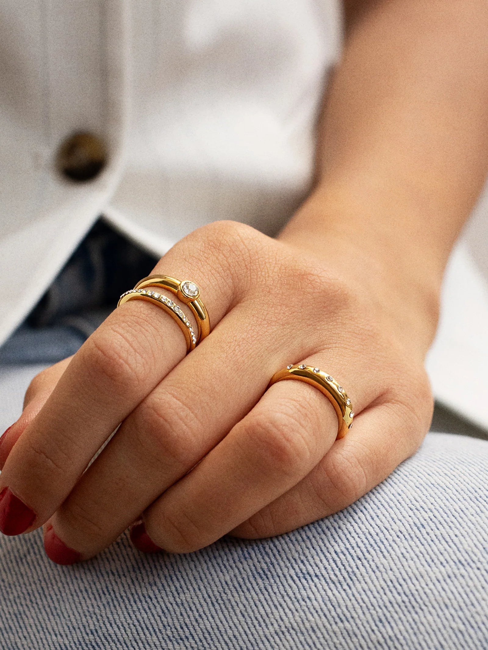 Curated for effortless stacking, the Jenny Ring Set will be your go-to for everyday styling. These three gold rings each feature clear stones to add subtle sparkle — however you style them. Wear them together for a cohesive ring stack, or separately for a minimalistic vibe.