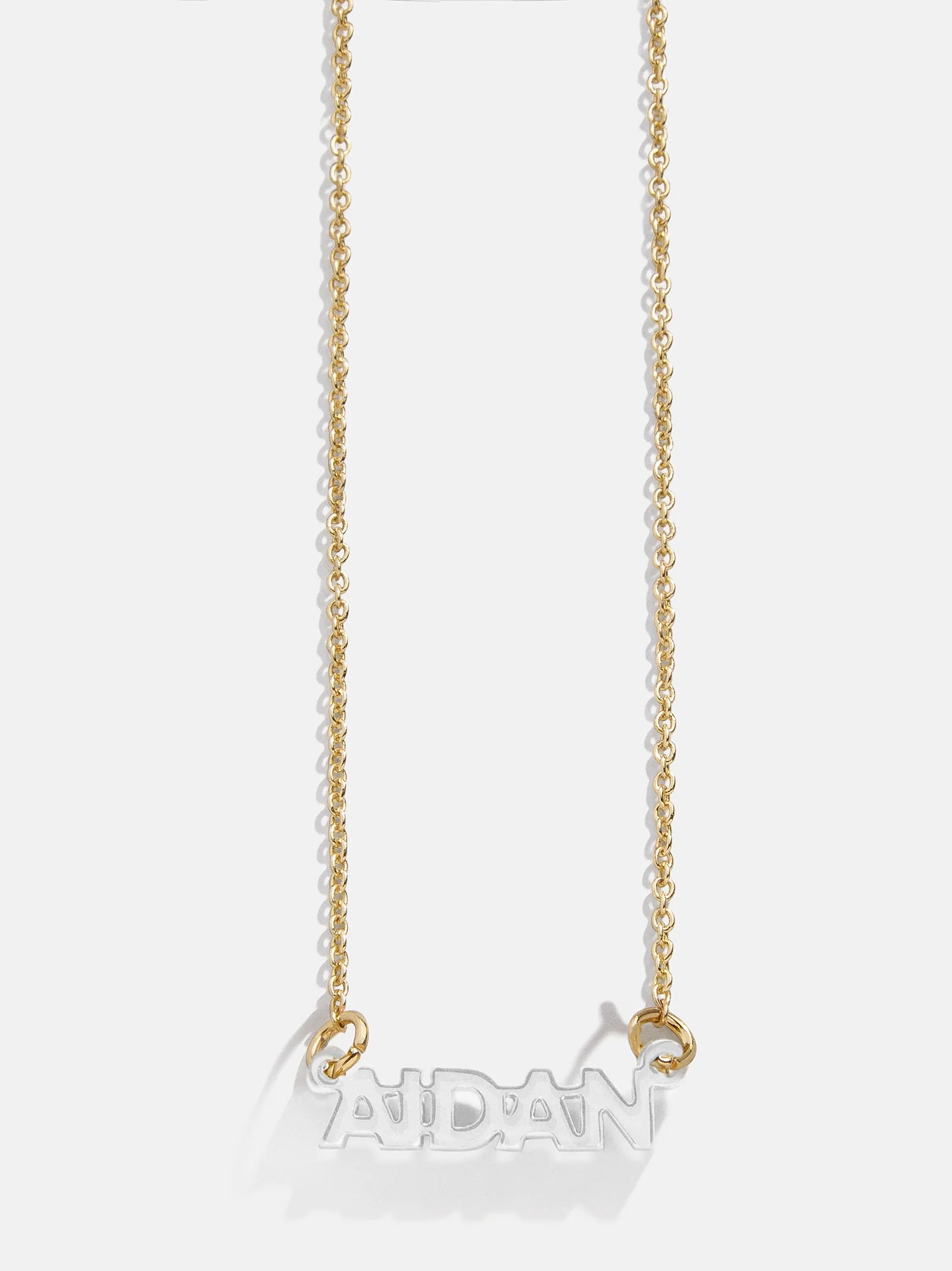 Spice up your child's style with our Kids' Custom Nameplate Necklace! Featuring a playful acrylic nameplate with the choice of your color and gold chain, this accessory is perfect for kids who love to stand out.