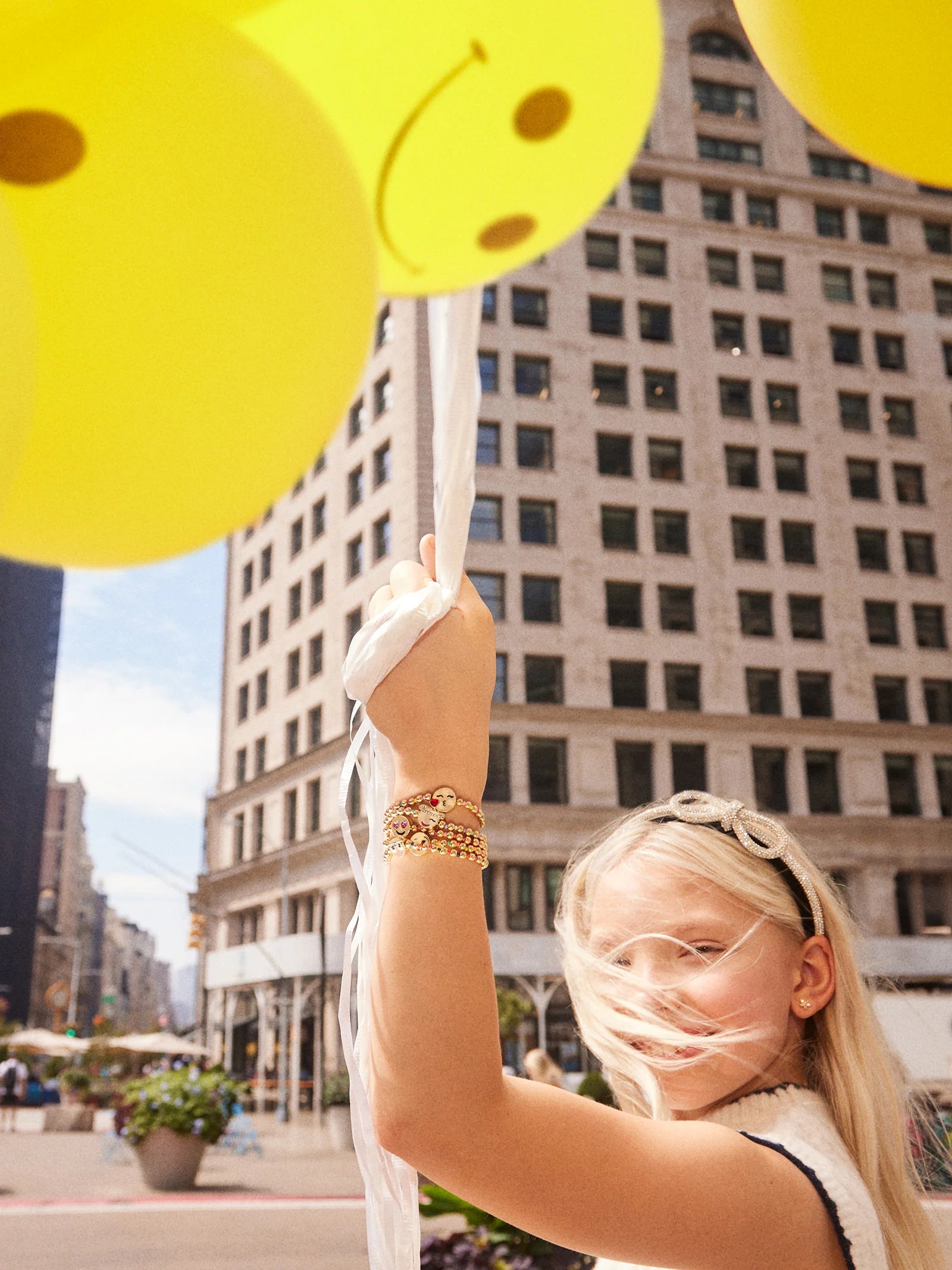 The Kids' Emoji Pisa Bracelet Set comes with five unique gold beaded bracelets. Each bracelet is complete with a bead in the center in a range of fun emoji motifs: the winky face, the smarty pants face, the crush face, the angel face, and the kissy face. Gift as a set to your little one, or split them apart to gift to them and all of their friends.