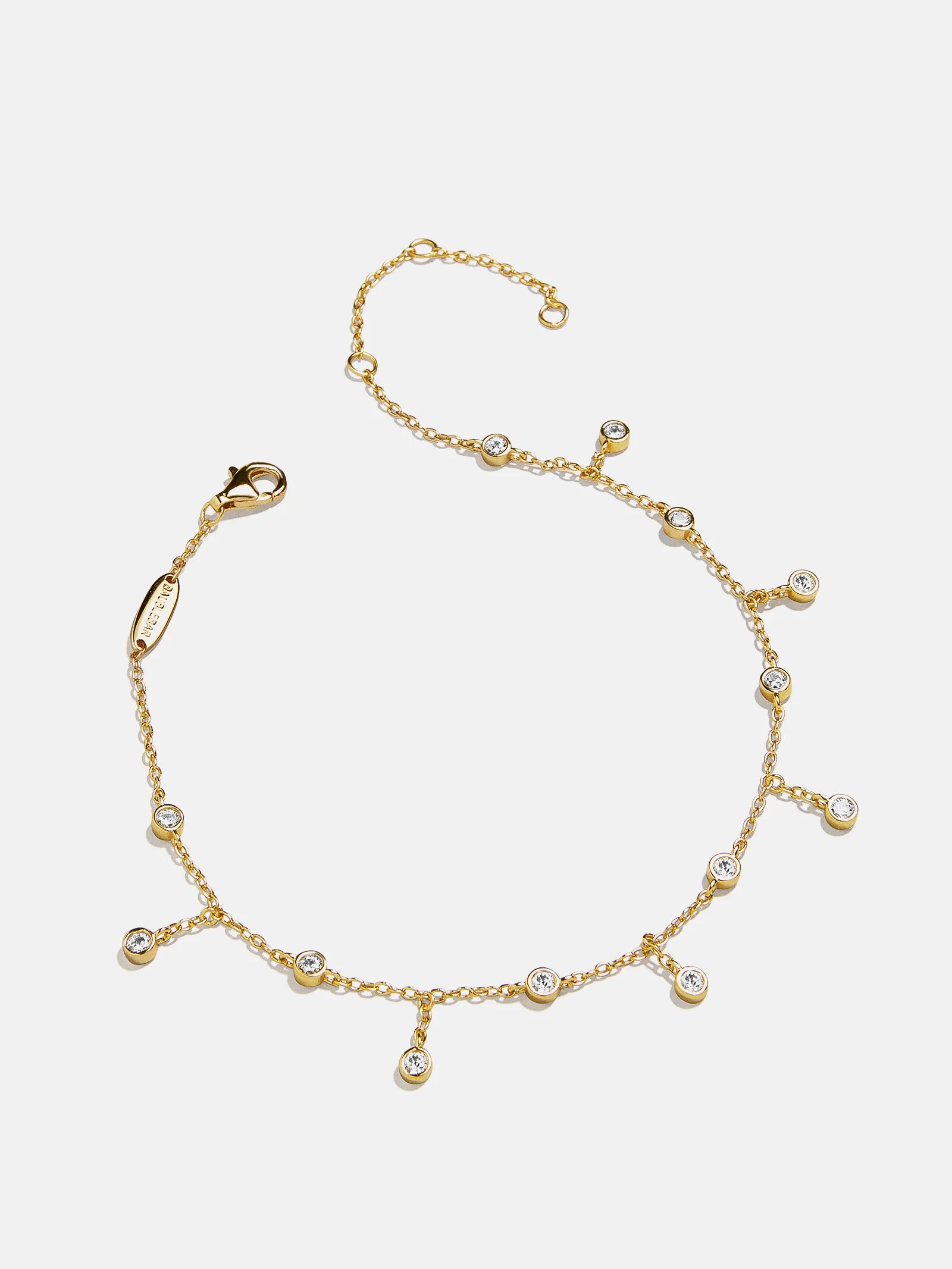 Classic and refined, you can’t go wrong with the Leslie 18K Gold Anklet. Luxe bezel crystals dangle from this dainty chain anklet, creating a look that’s effortlessly elegant for any occasion. Perfect for adding a subtle shimmer to your everyday style or complementing your favorite sandals, this anklet will last for years with its 18K Gold material.