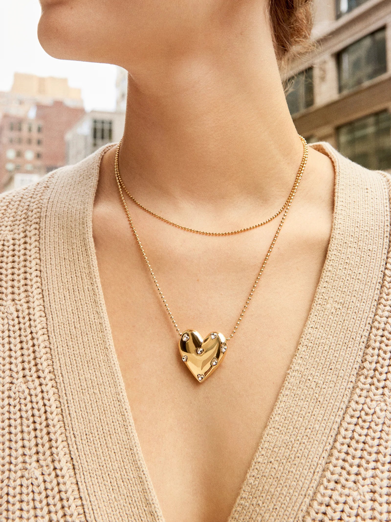 Every jewelry box needs a heart silhouette, and the Melina Necklace just might be our favorite choice. A chunky gold heart pendant is strung on a classic gold chain and adorned with tiny, pretty glass stones. We love this one layered with a few other dainty chain styles to really round out your stack.