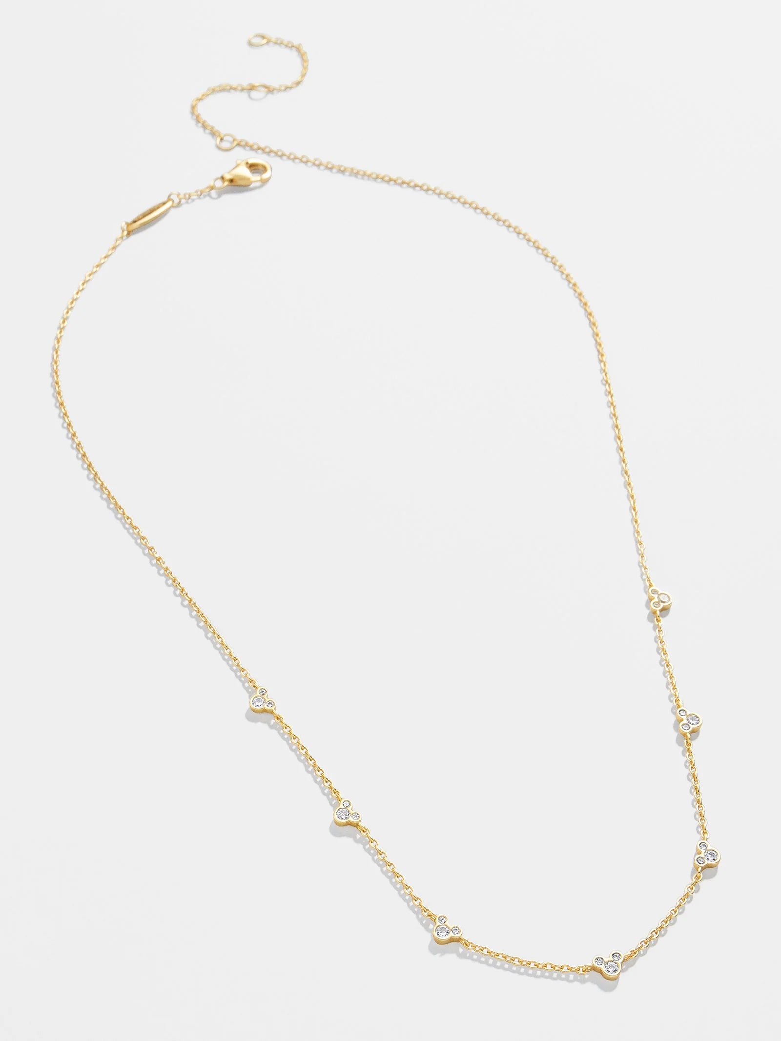 Perfect for layering, the Mickey Mouse Outline Necklace is a dainty take on your favorite character. A Mickey Mouse outline repeats across the elegant chain. Even better? It's crafted from 18K gold plated sterling silver and the Mickey Mouse outlines feature Cubic Zirconia stones.