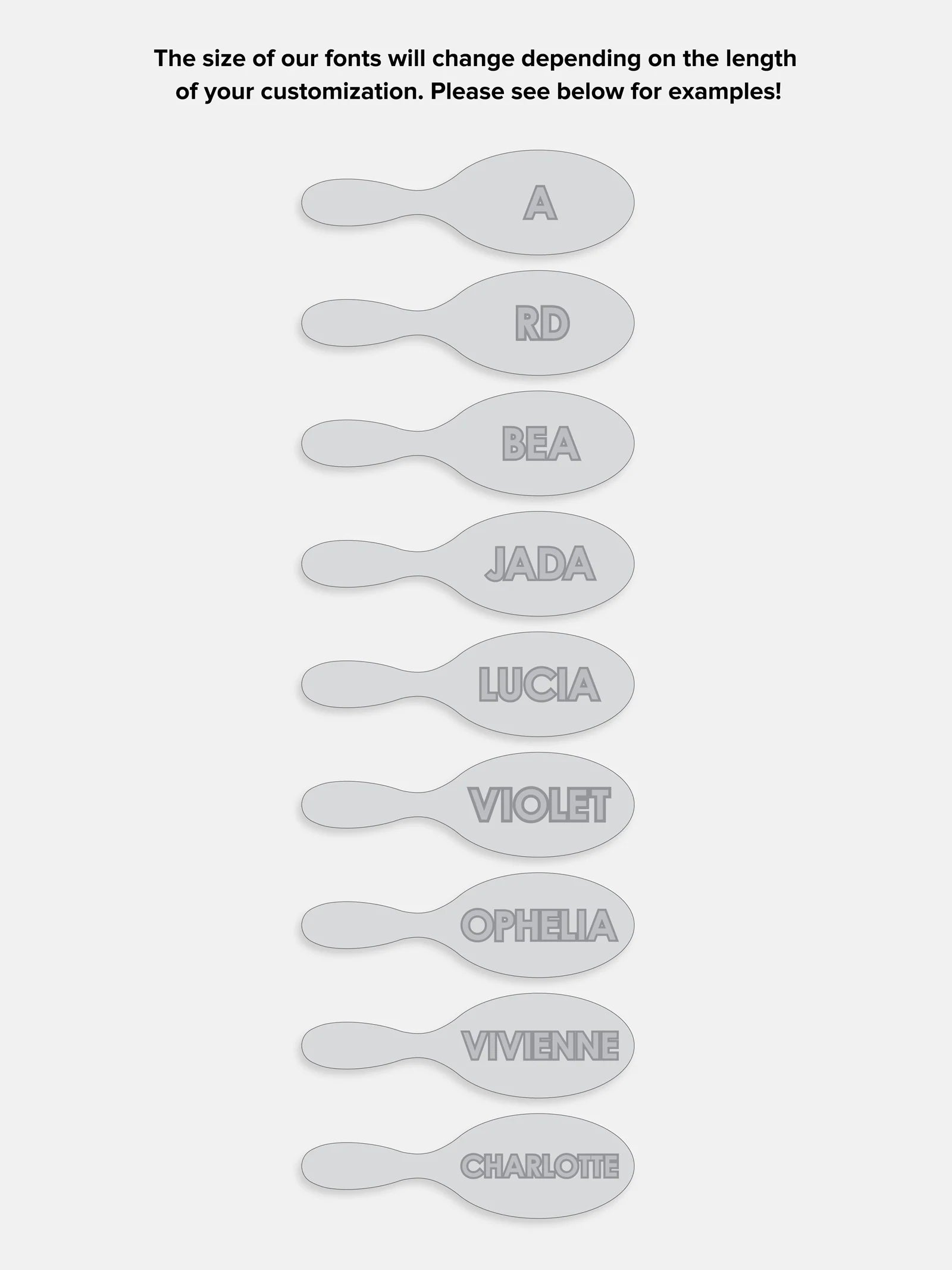 ABOUT OUR CUSTOM HAIR BRUSHES: Our collection of custom hair brushes make your everyday routine just a little more extra - because why not? Inspired by our best-selling custom phone cases, each is crafted with a sturdy, substantial, and water resistant acetate base. Every letter is also made with durable acetate and hand-cut to your specifications. The raised nature of the letters creates a fun, 3D effect. Finally, each of the bristles is made from nylon and silicone, reducing static and/or tangles. Fun fact: each brush is crafted in a dust-free room, ensuring that your piece will be absolutely perfect and free of any flaws.