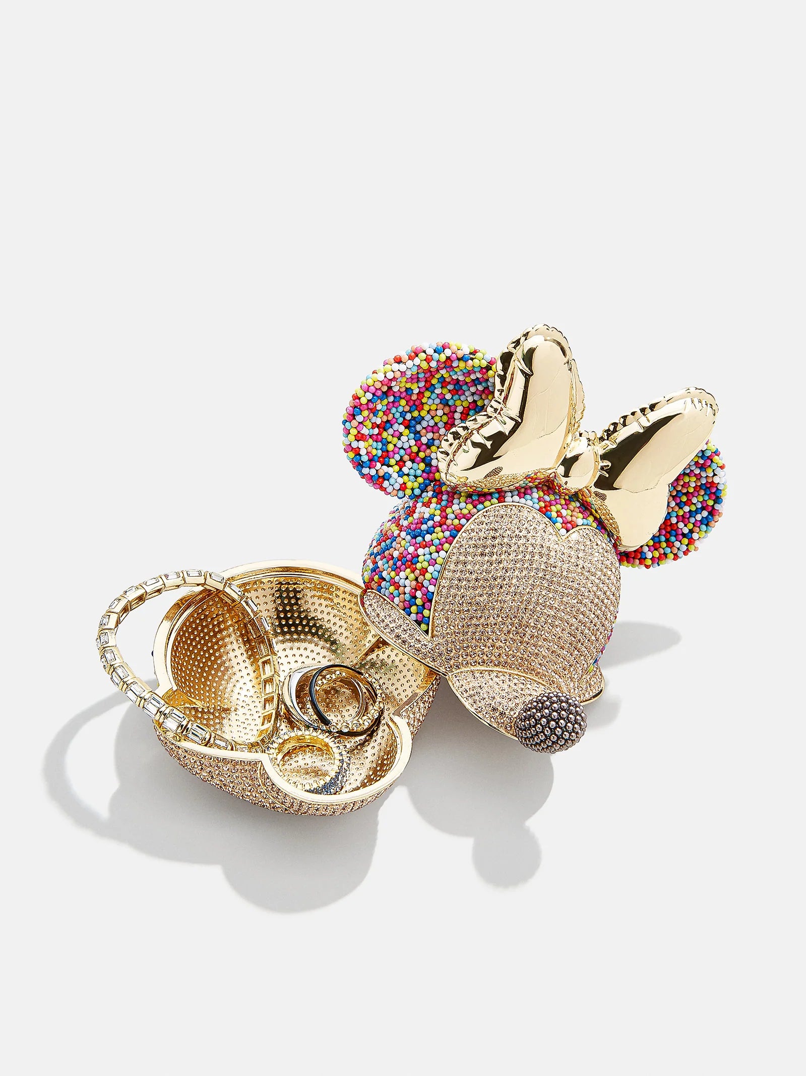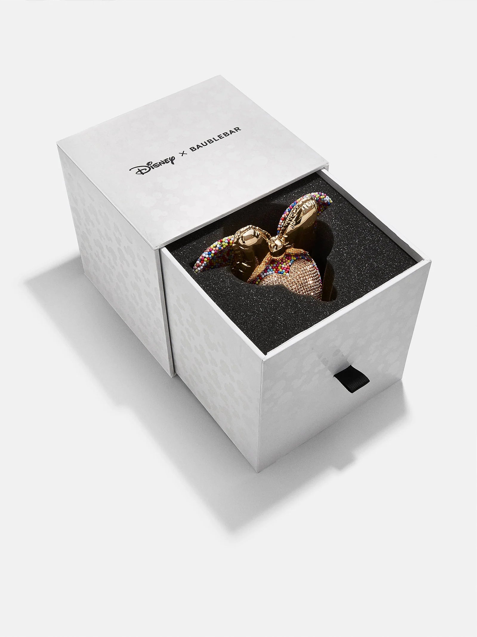 Looking for an adorable way to store your Disney x BaubleBar pieces? Our Minnie Mouse Disney Catchall - Birthday is the answer. This gorgeous jewelry storage piece features tons of sparkle thanks to thousands of crystals, the recognizable Minnie Mouse Birthday sprinkle ears, and a balloon-inspired bow. Each individual crystal is hand set, making this luxury accessory extra intricate. Not only can it hold all of your favorite pieces, this detailed dish can double as perfect Disney decor for any room or space.
