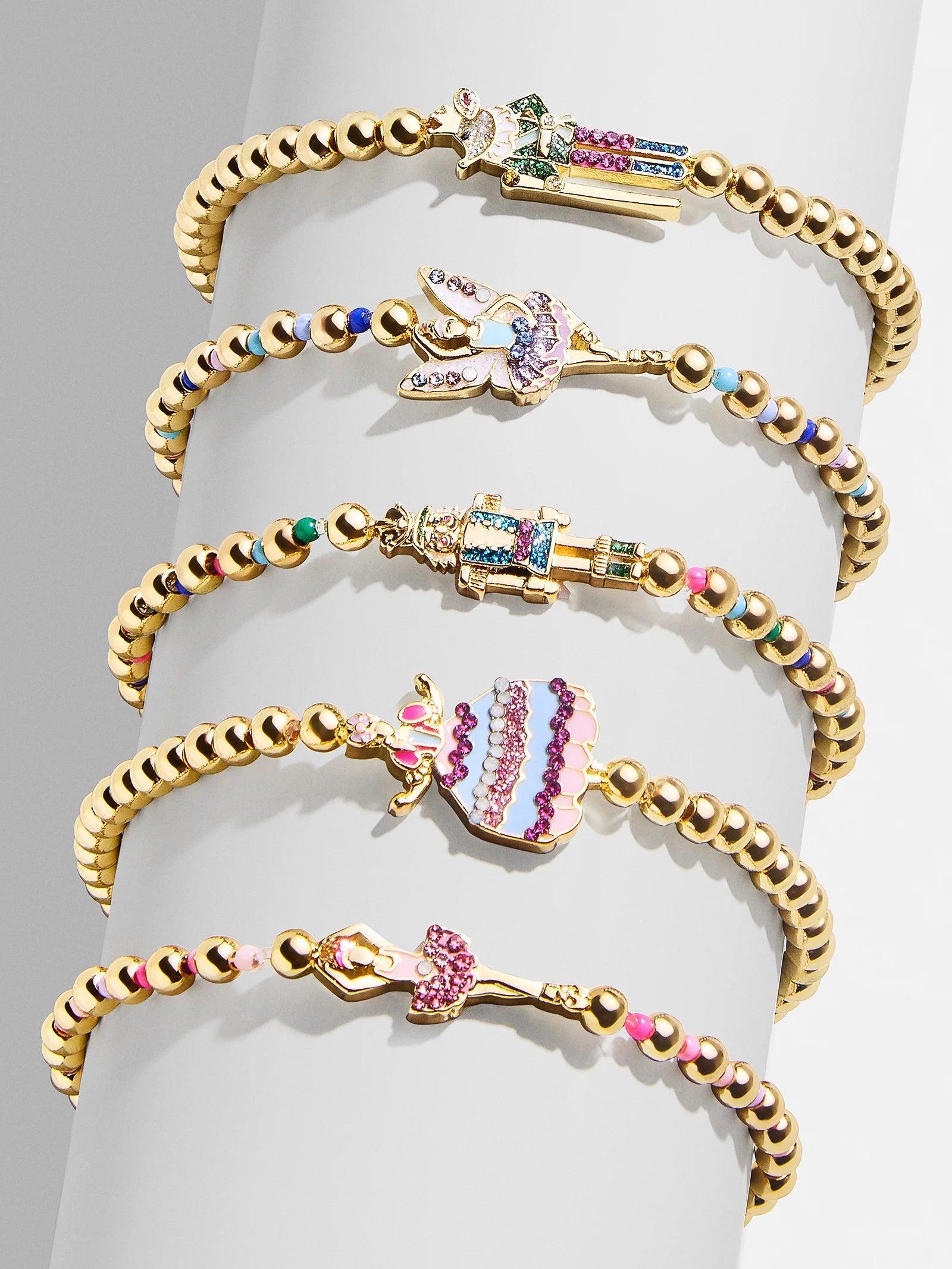 Get into the holiday season with en pointe styles. The Night At The Ballet Kids' Bracelet Set features 5 stretch bracelets, each with a charm of a Nutcracker character. Mix and match, stack 'em up, or share them with friends — this holiday bracelet set is a classic favorite.
