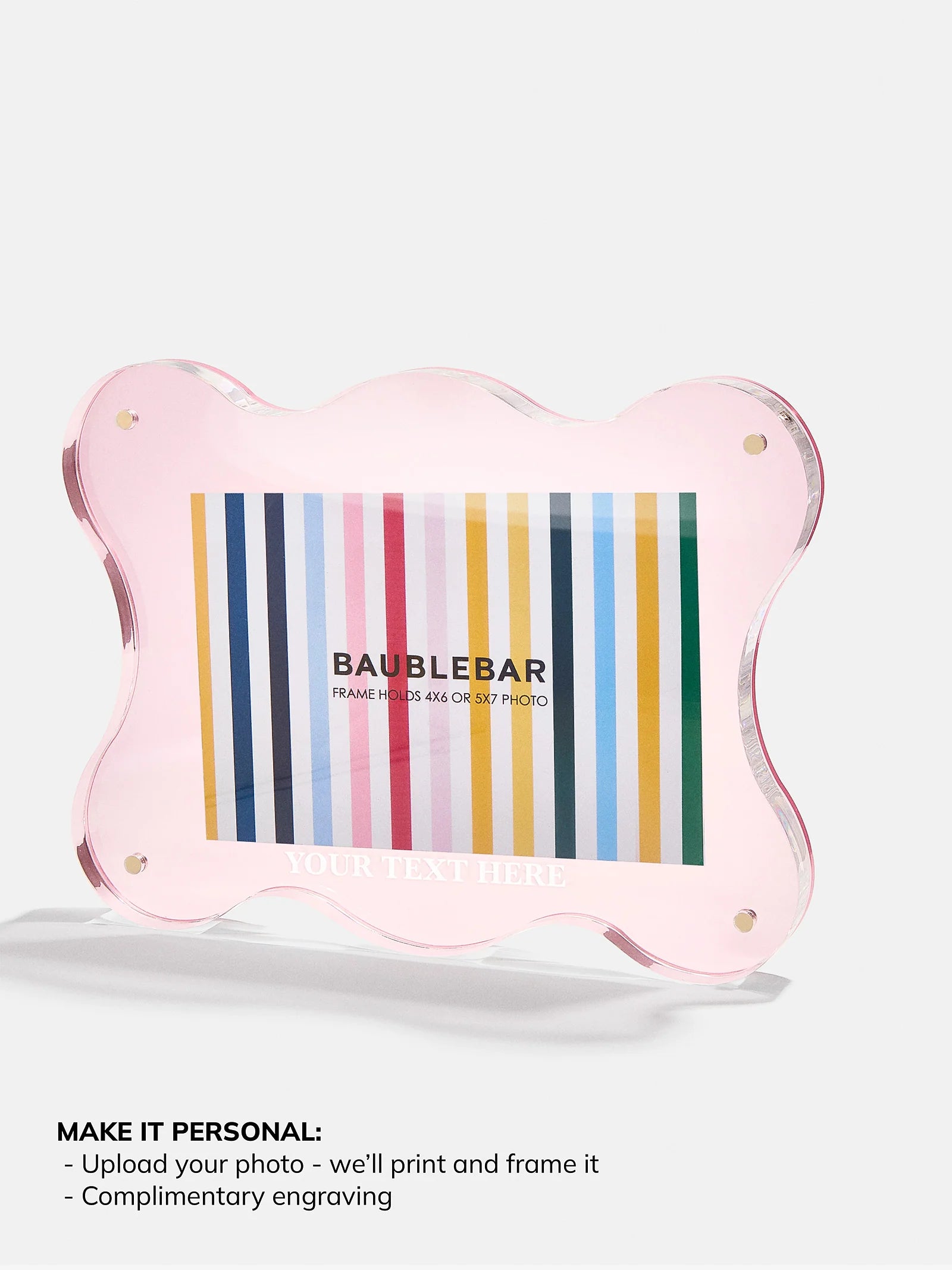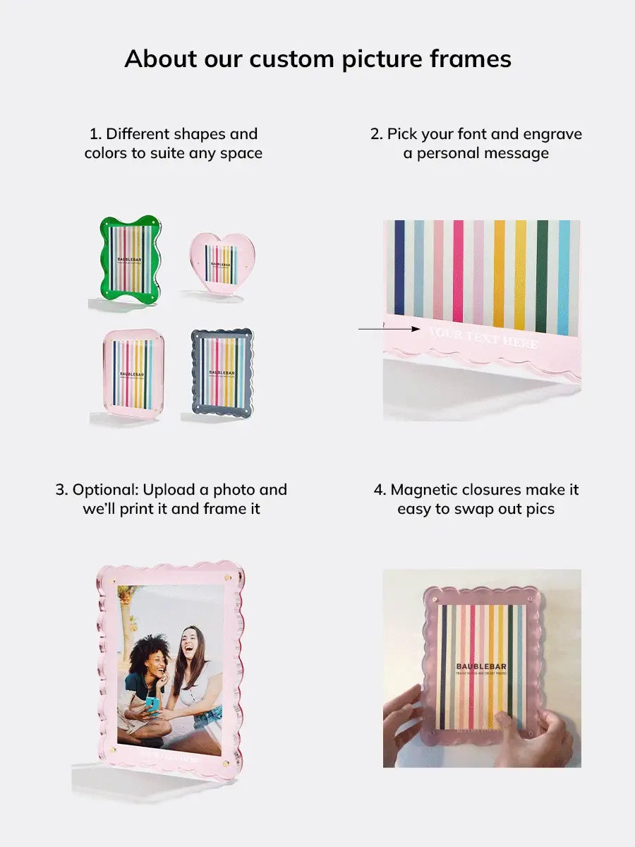 Frames can hold photos up to 7x5. All photos printed by BaubleBar will be printed as 7x5.