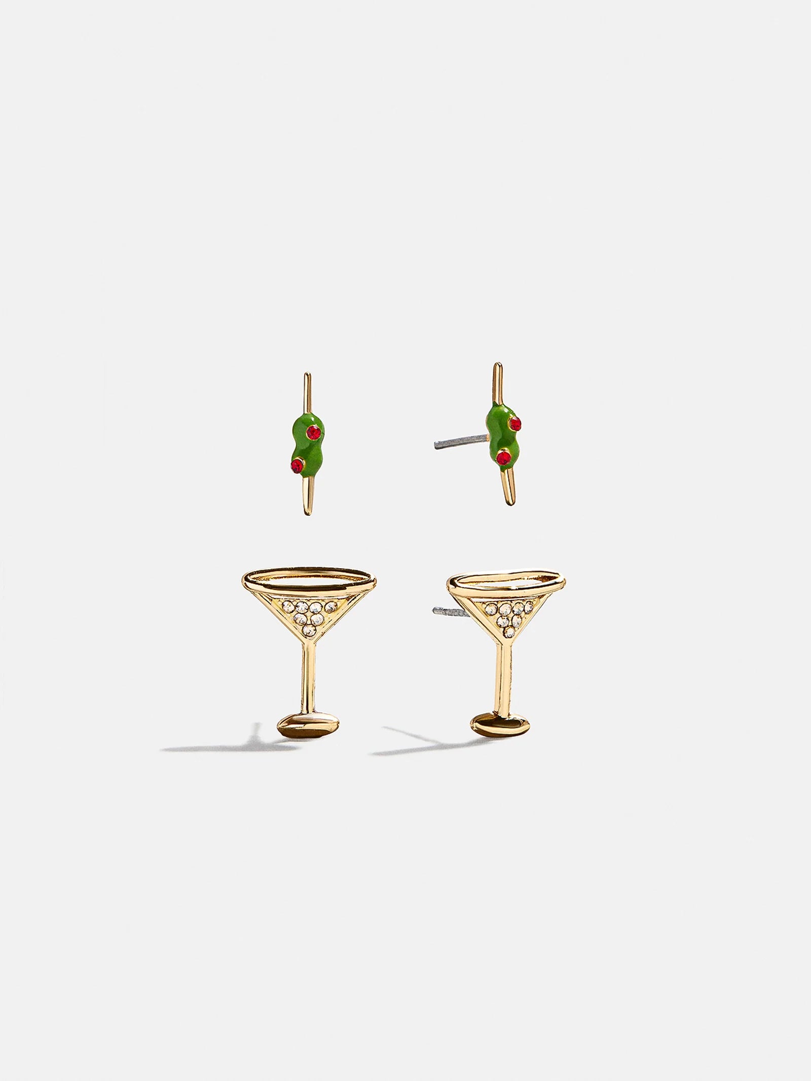 Shake (or stir) things up with the Pimento Memento Martini Earring Set. This set includes pave martini glasses paired with olive stud earrings. The martini glasses are crafted with dainty stones to resemble your favorite dirty martini. Sport this pair for your next happy hour or night out to really get the party started. Please note: each pair sold separately.