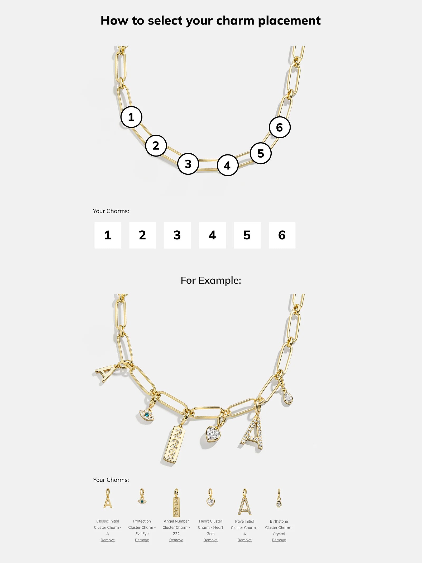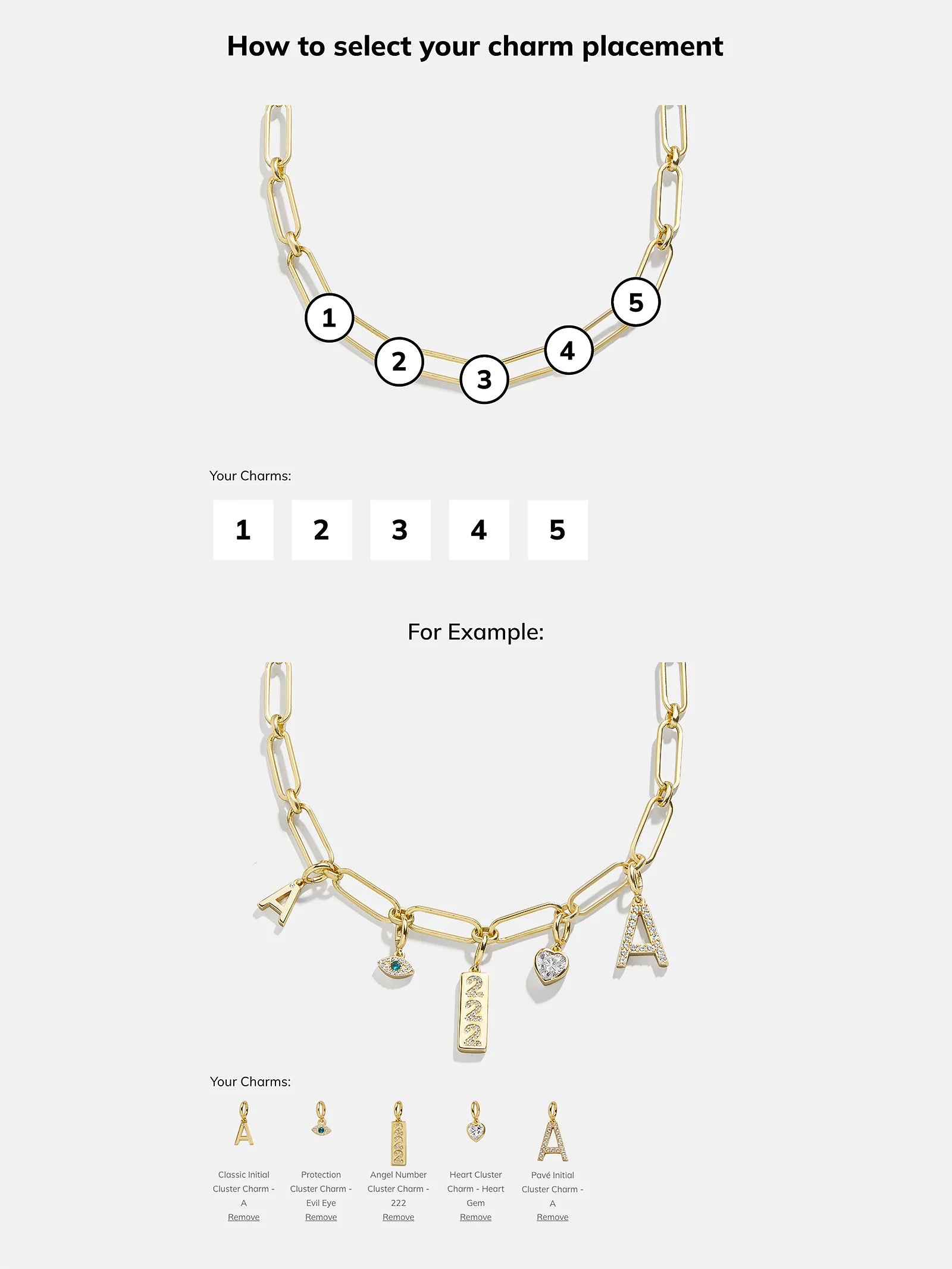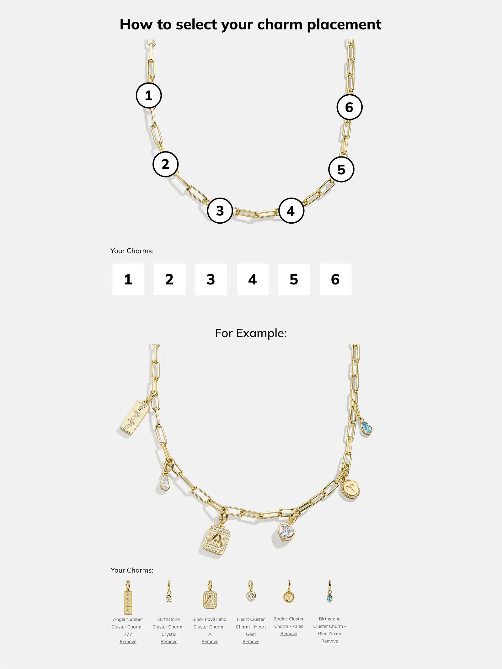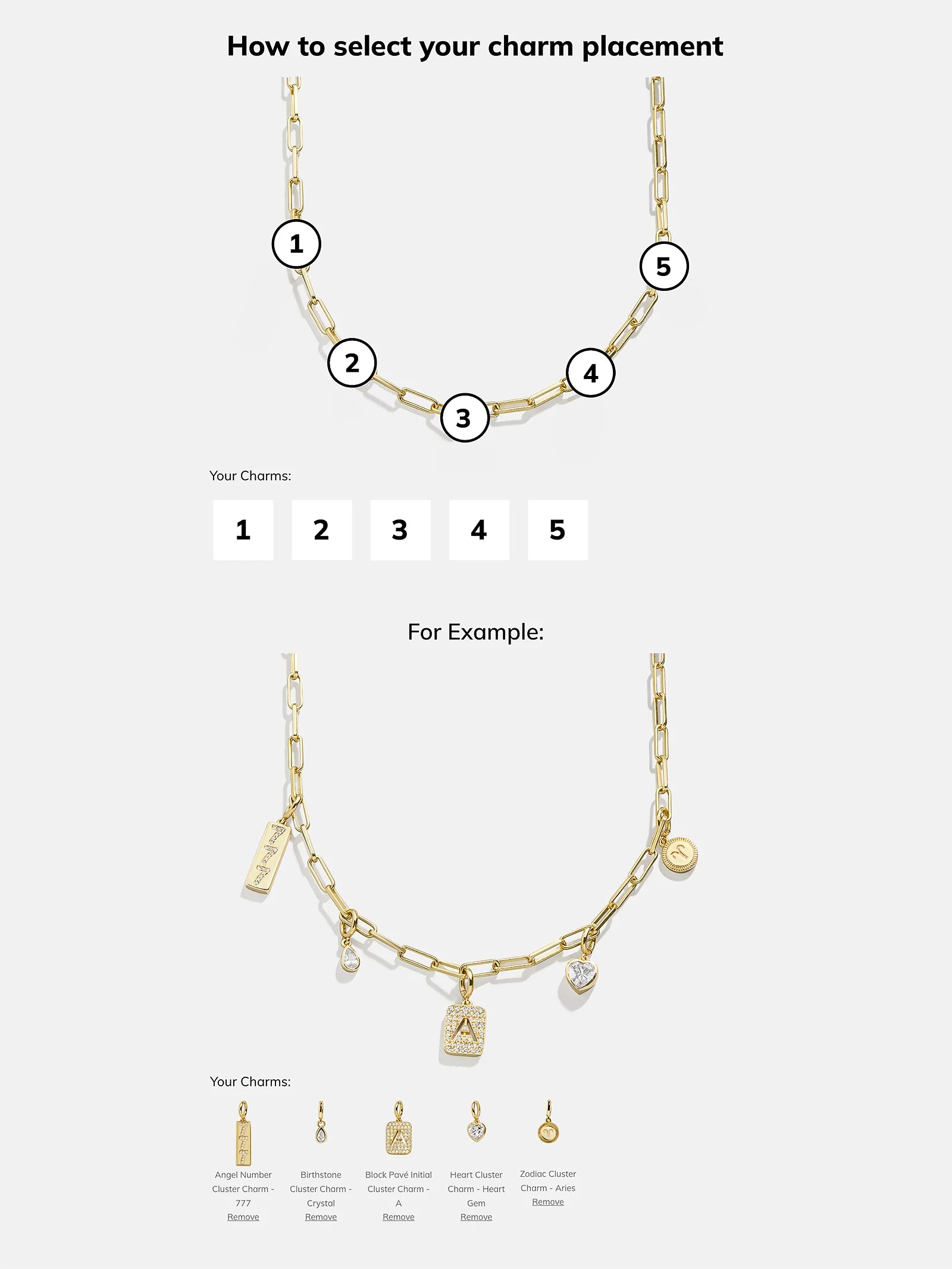 Personalize your necklace layers with the Spaced Custom Charm Necklace. Choose between a classic gold-colored chain, a Hera chain, or a paperclip chain. Then, pick 5 cute charms of your choice, in the order that you'd like. Made just for you, this necklace will be an everyday must-have.