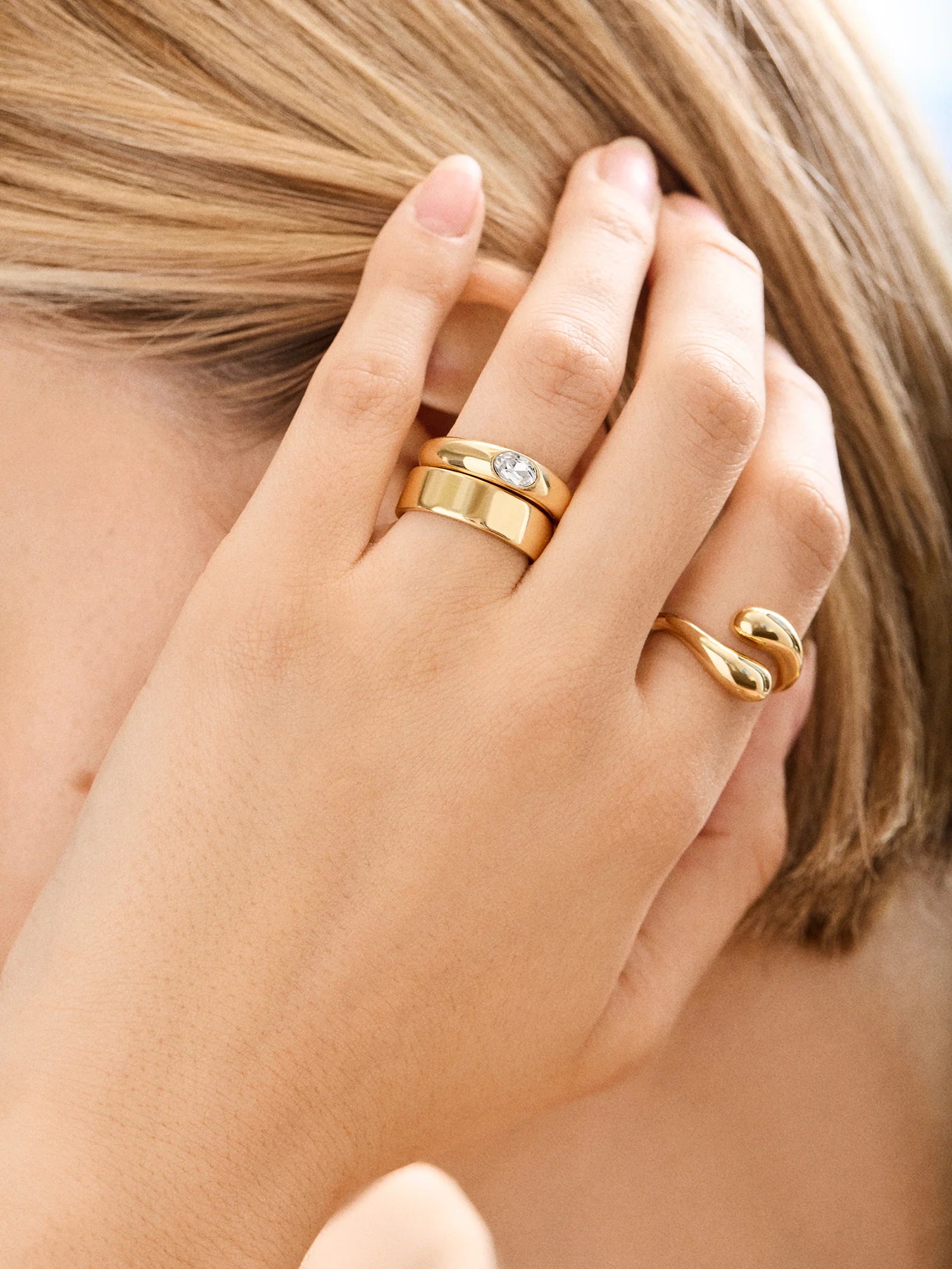 Elevate your everyday jewelry looks with the Stevie Ring, It's classic gold and in a thick, chic band, making it perfect for a bold solo statement or for effortless stacking when your fingers feel a little naked. Always timeless, slip it on and let the compliments roll in.
