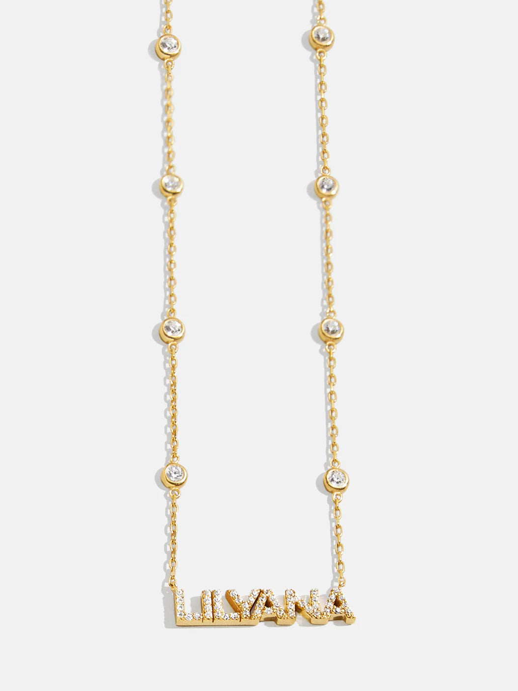 We took our beloved, best-selling Yasmine style and gave it a personalized touch with our Yasmine 18K Gold Custom Nameplate Necklace. This custom name piece features the personalization of your choosing framed by a contemporary18K Gold chain. Dotted with high-shine Cubic Zirconia bezel stones, this accessory is sure to become a staple in your everyday ensemble.