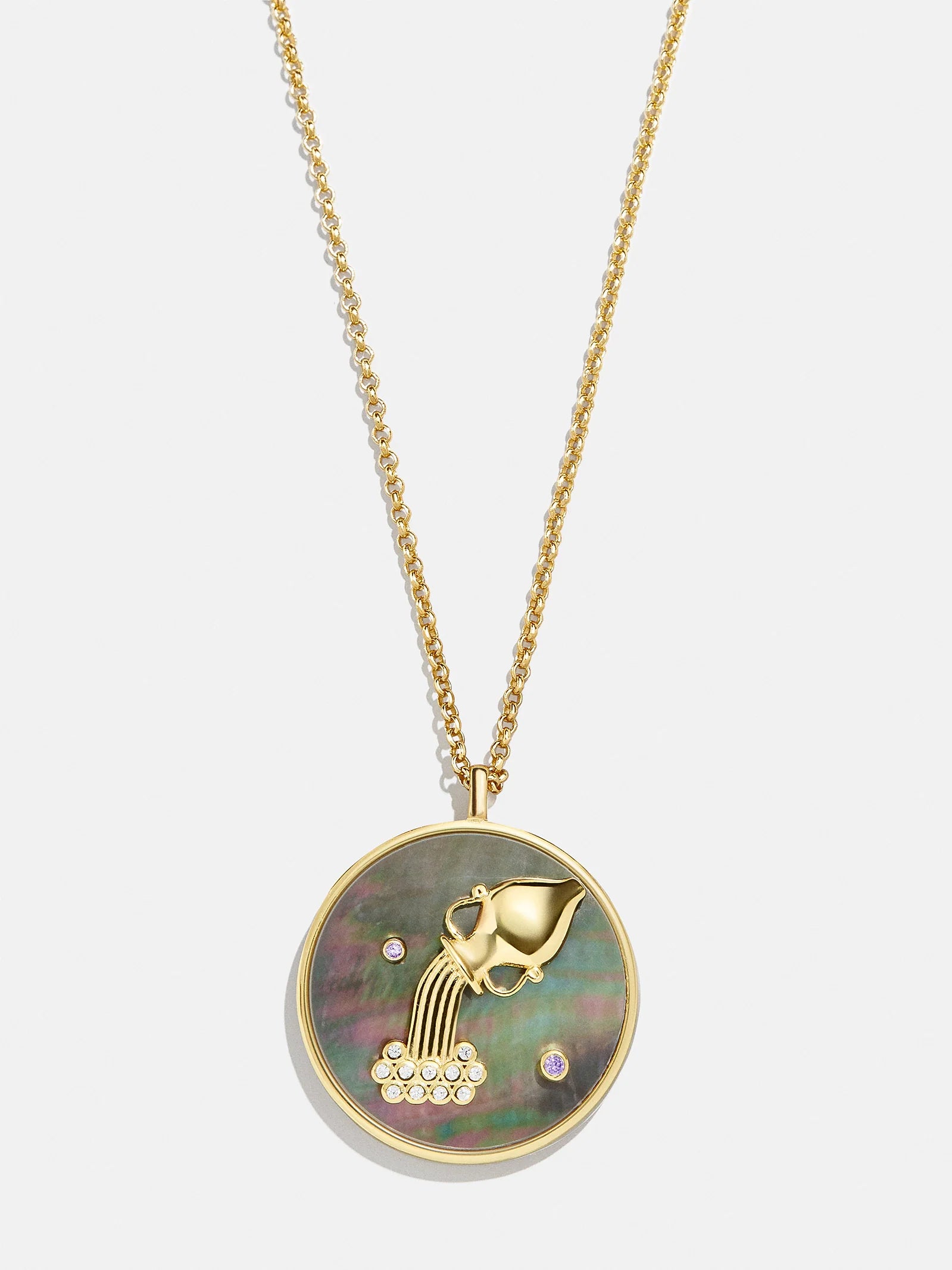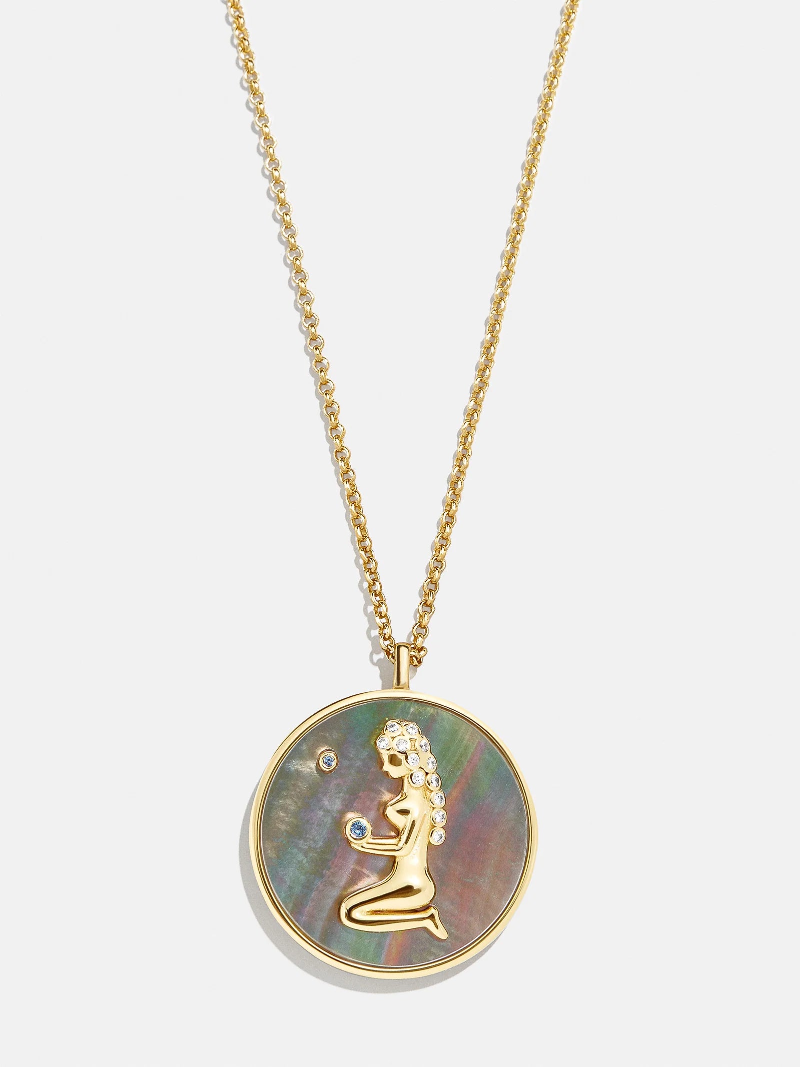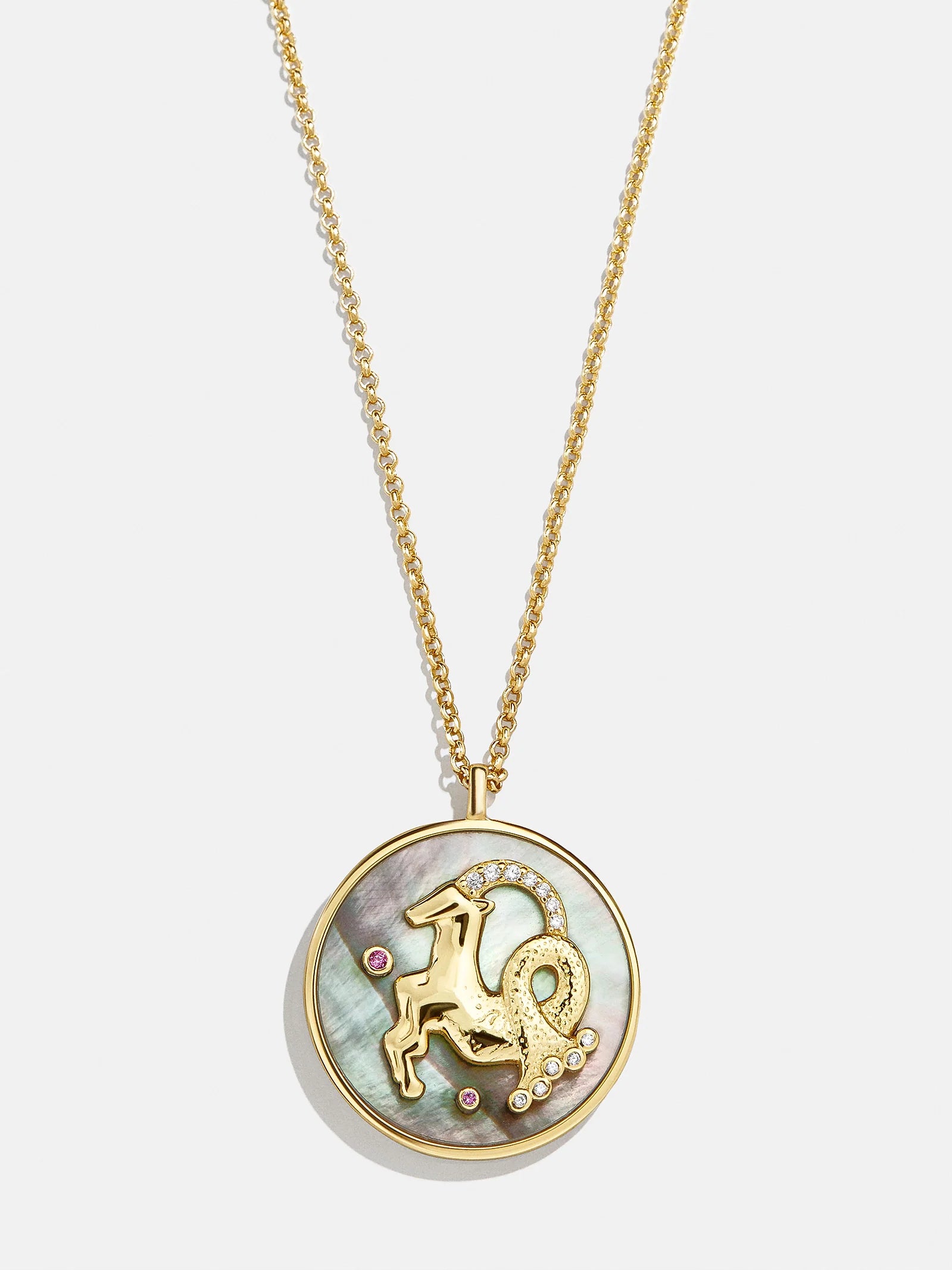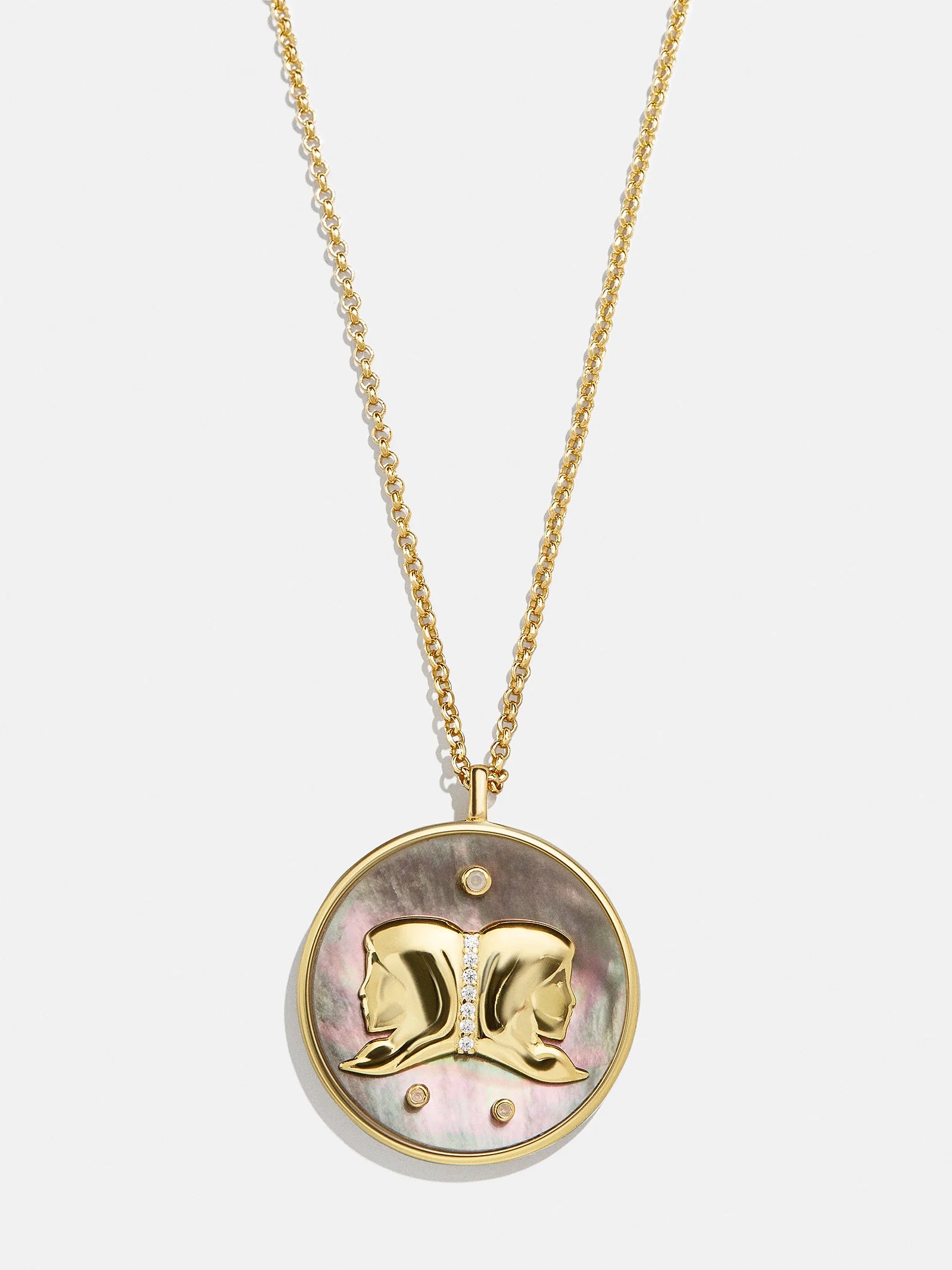 This is your sign. Our collection of reversible zodiac medallion necklaces will be by your side through every solar return, Mercury retrograde, and lunar eclipse. Each pendant is crafted with 18K Gold and luxe Cubic Zirconia stones. One side features gorgeous mother of pearl with gem accents, while the other is gold with a pretty pavé border. Opt to add your sun, moon, or rising sign (or all three!) to your stack for layers that will guarantee good energy.